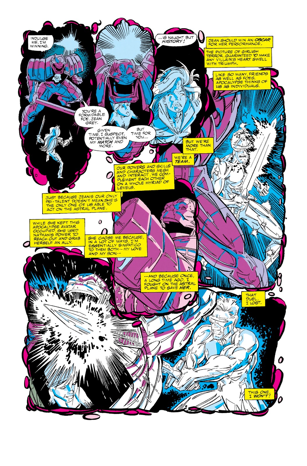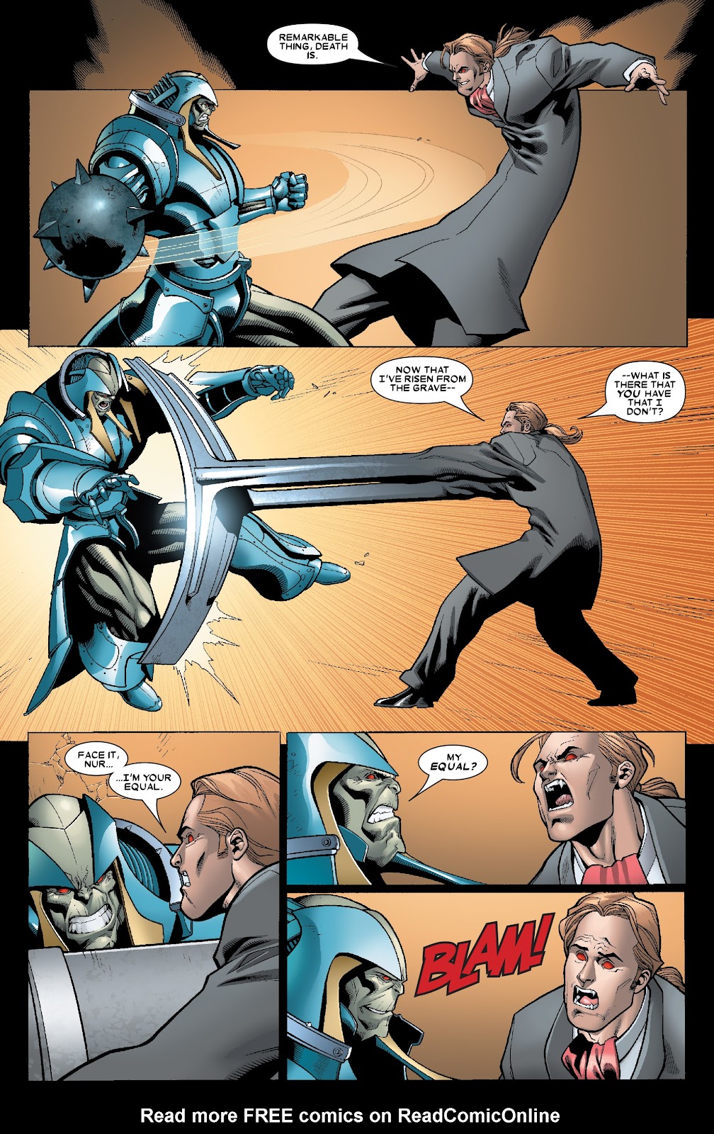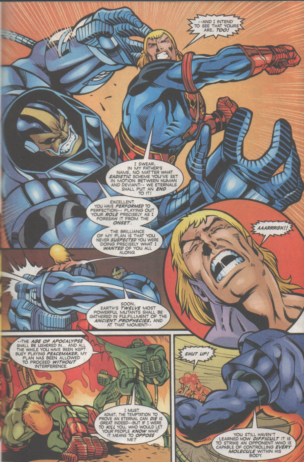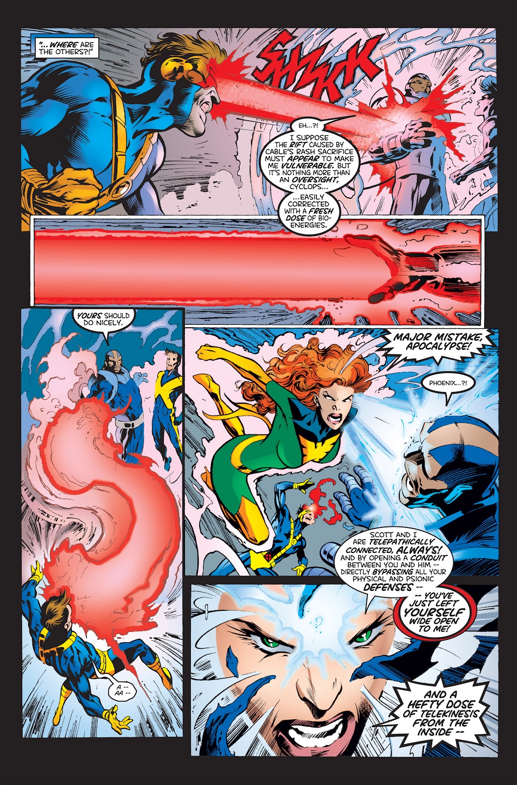 Poder destructivo: Nivel muro+ (En su Estado Incompleto, puede partir ataúdes con sus cuchillas o arrancar un gran portón de madera con un solo movimiento. Pudo enfrentarse a un vampiro que poseía suficiente fuerza sobrehumana como para abollar paredes y lo sometió con facilidad) | Nivel estructura+ (En su Estado Incompleto, sus rayos de energía producen explosiones capaces de abollar secciones de un Centinela del tamaño de un edificio) | Multi-estructura+ (En su Estado Incompleto, es capaz de explotar un laboratorio con una simple descarga de energía o generar devastadores tornados con un solo soplido) | Multi-ciudad+ (En su Estado Incompleto, pudo superar y derrotar a Colossus en un combate sin restricciones con relativa facilidad, y como referencia, este último era capaz de sacudir montañas con sus golpes, abrirse paso a través de masas de roca de billones de toneladas, y soportar el peso de montañas) | Multi-estelar+ (En su Estado Máximo, fue capaz de igualar a un Cable desatado en un combate a muerte y superarlo conforme se desarrollaba el encuentro, y como referencia, previamente se mencionaba que el máximo poder de Cable desde que era un infante opacaba al colapso de una estrella y en otras ocasiones se mencionaba que podría extinguir una estrella sin mucho esfuerzo. Desde que era joven, Apocalipsis manifestó brevemente un poder equivalente a una estrella antes de caer desfallecido, y en su etapa evolucionada mencionó poseer un poder superior al de las estrellas) | Multi-galáctico+ (Con su Armadura Celestial, es provisto de tecnología que lo ponen a un nivel comparable a los Celestiales comunes, los cuales son capaces de destruir galaxias. Se menciona que fue capaz de matar al Celestial Jardinero en una ocasión. Posee un nivel comparable al Alto Evolucionador y logra igualar sus rayos de energía más poderosos en un combate serio, y como referencia, este último pudo igualar temporalmente las descargas cósmicas de Galactus, quien a su vez es capaz de mover una galaxia con su ráfaga de energía más simple) | Puede apagar el cerebro de sus oponentes con sus descargas de energía especial.