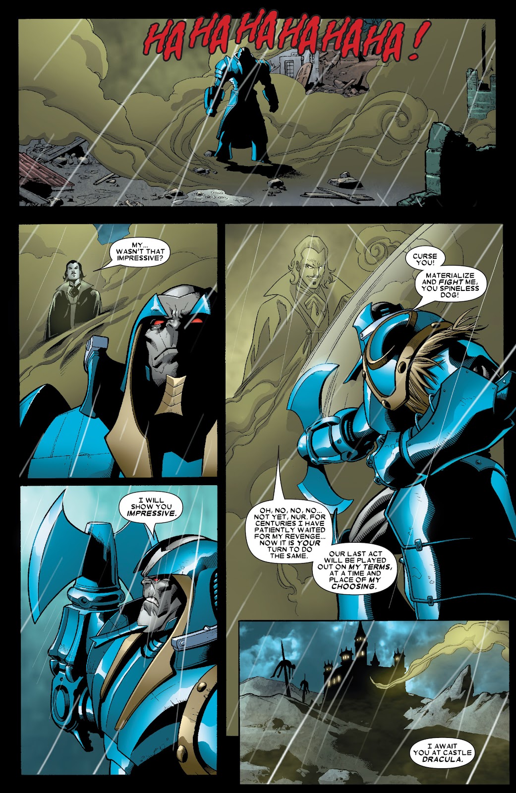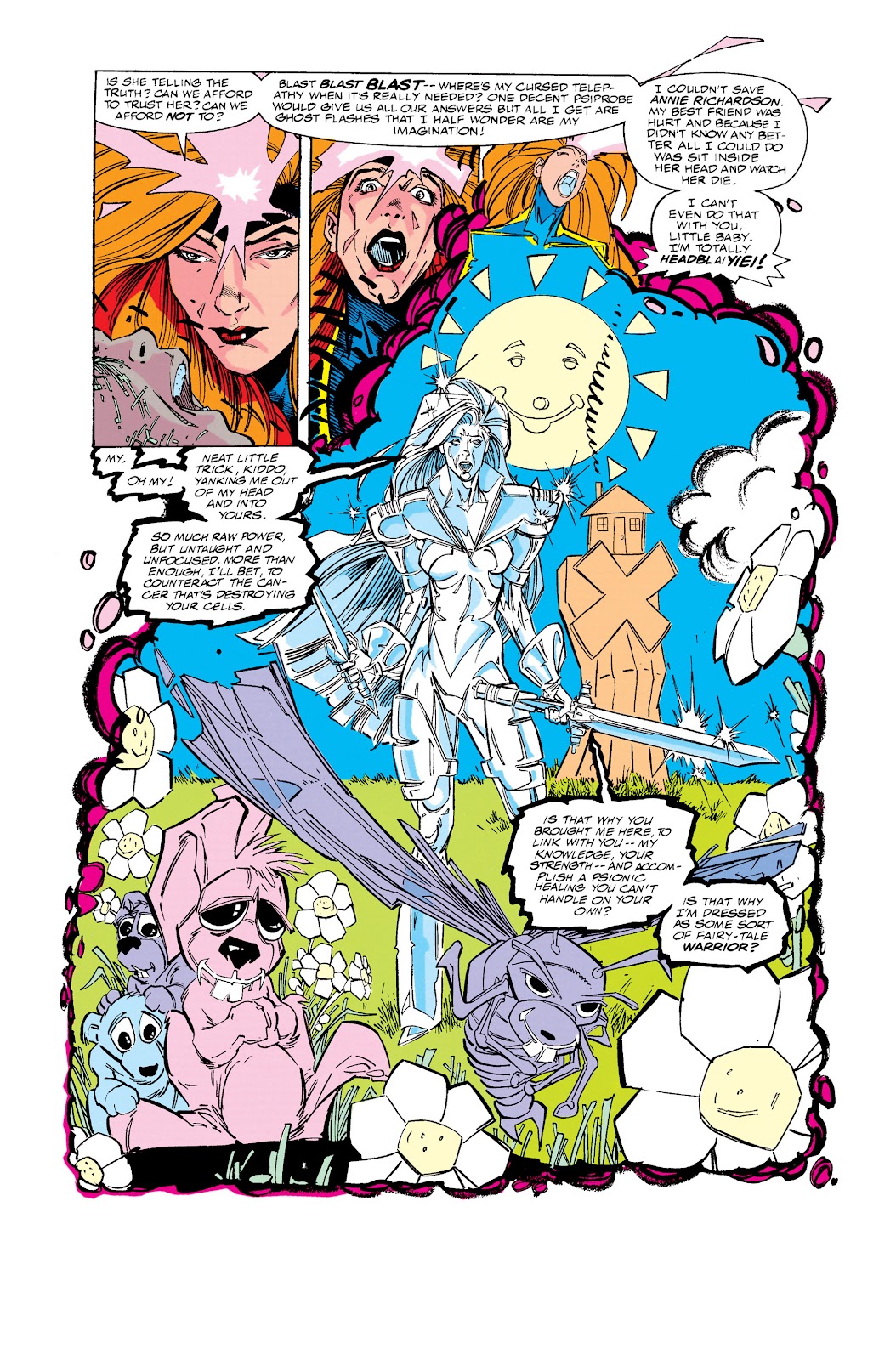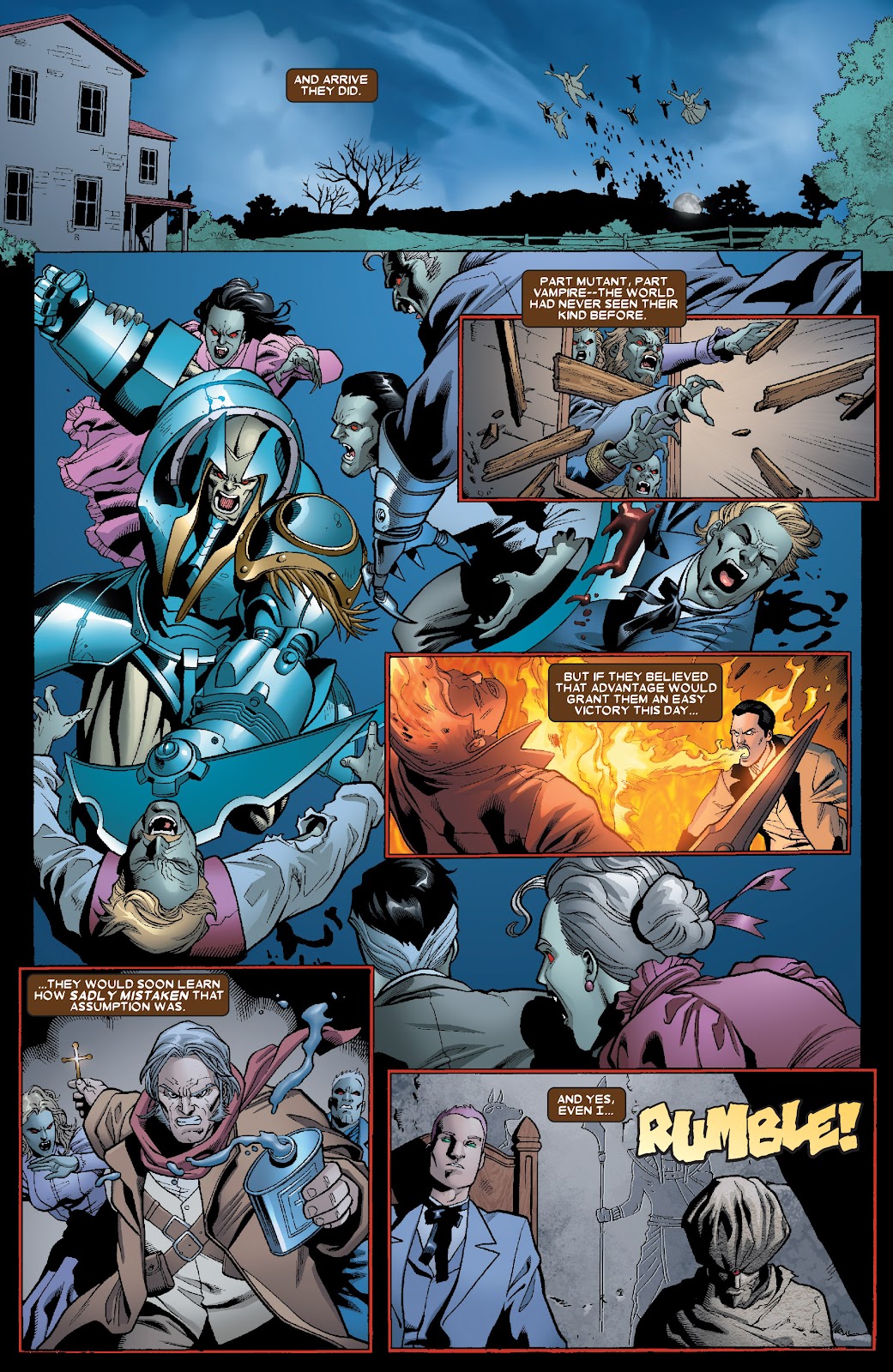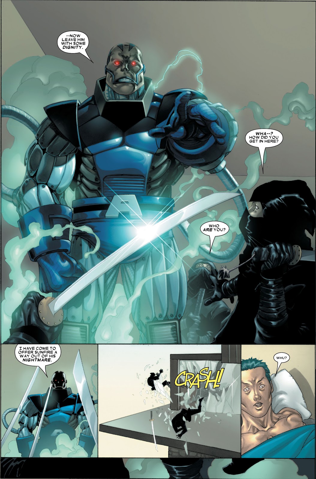 Poder destructivo: Nivel muro+ (En su Estado Incompleto, puede partir ataúdes con sus cuchillas o arrancar un gran portón de madera con un solo movimiento. Pudo enfrentarse a un vampiro que poseía suficiente fuerza sobrehumana como para abollar paredes y lo sometió con facilidad) | Nivel estructura+ (En su Estado Incompleto, sus rayos de energía producen explosiones capaces de abollar secciones de un Centinela del tamaño de un edificio) | Multi-estructura+ (En su Estado Incompleto, es capaz de explotar un laboratorio con una simple descarga de energía o generar devastadores tornados con un solo soplido) | Multi-ciudad+ (En su Estado Incompleto, pudo superar y derrotar a Colossus en un combate sin restricciones con relativa facilidad, y como referencia, este último era capaz de sacudir montañas con sus golpes, abrirse paso a través de masas de roca de billones de toneladas, y soportar el peso de montañas) | Multi-estelar+ (En su Estado Máximo, fue capaz de igualar a un Cable desatado en un combate a muerte y superarlo conforme se desarrollaba el encuentro, y como referencia, previamente se mencionaba que el máximo poder de Cable desde que era un infante opacaba al colapso de una estrella y en otras ocasiones se mencionaba que podría extinguir una estrella sin mucho esfuerzo. Desde que era joven, Apocalipsis manifestó brevemente un poder equivalente a una estrella antes de caer desfallecido, y en su etapa evolucionada mencionó poseer un poder superior al de las estrellas) | Multi-galáctico+ (Con su Armadura Celestial, es provisto de tecnología que lo ponen a un nivel comparable a los Celestiales comunes, los cuales son capaces de destruir galaxias. Se menciona que fue capaz de matar al Celestial Jardinero en una ocasión. Posee un nivel comparable al Alto Evolucionador y logra igualar sus rayos de energía más poderosos en un combate serio, y como referencia, este último pudo igualar temporalmente las descargas cósmicas de Galactus, quien a su vez es capaz de mover una galaxia con su ráfaga de energía más simple) | Puede apagar el cerebro de sus oponentes con sus descargas de energía especial.