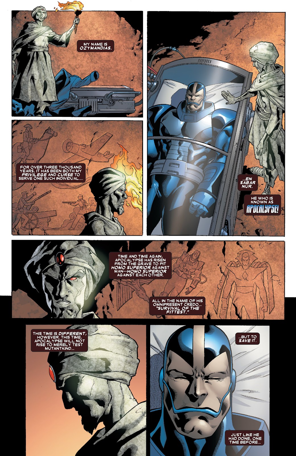 En Sabah Nur fue uno de los primeros mutantes encontrados en el antiguo Egipto, sería abandonado y posteriormente criado por una tribu de asaltantes. Con ellos aprendería que solo los más fuertes son aptos para sobrevivir en este mundo, y bajo esa idea se convertiría en un tirano y emperador, la mayor amenaza que han combatido los X-Men: Es el Dictador Apocalipsis!