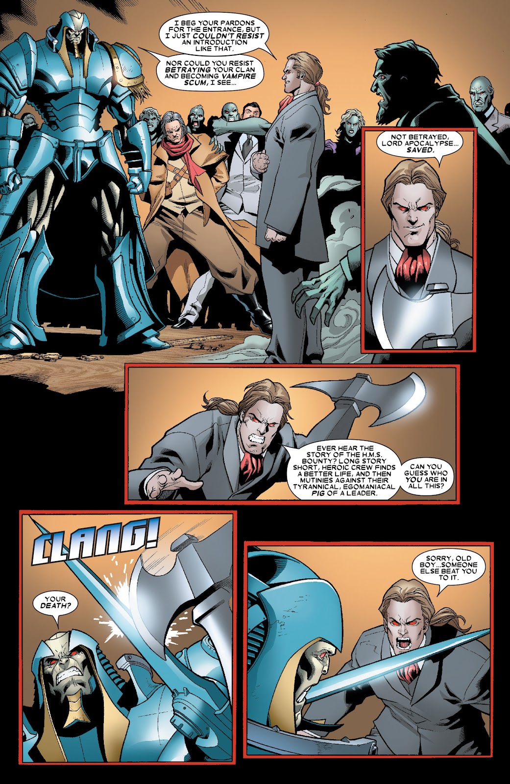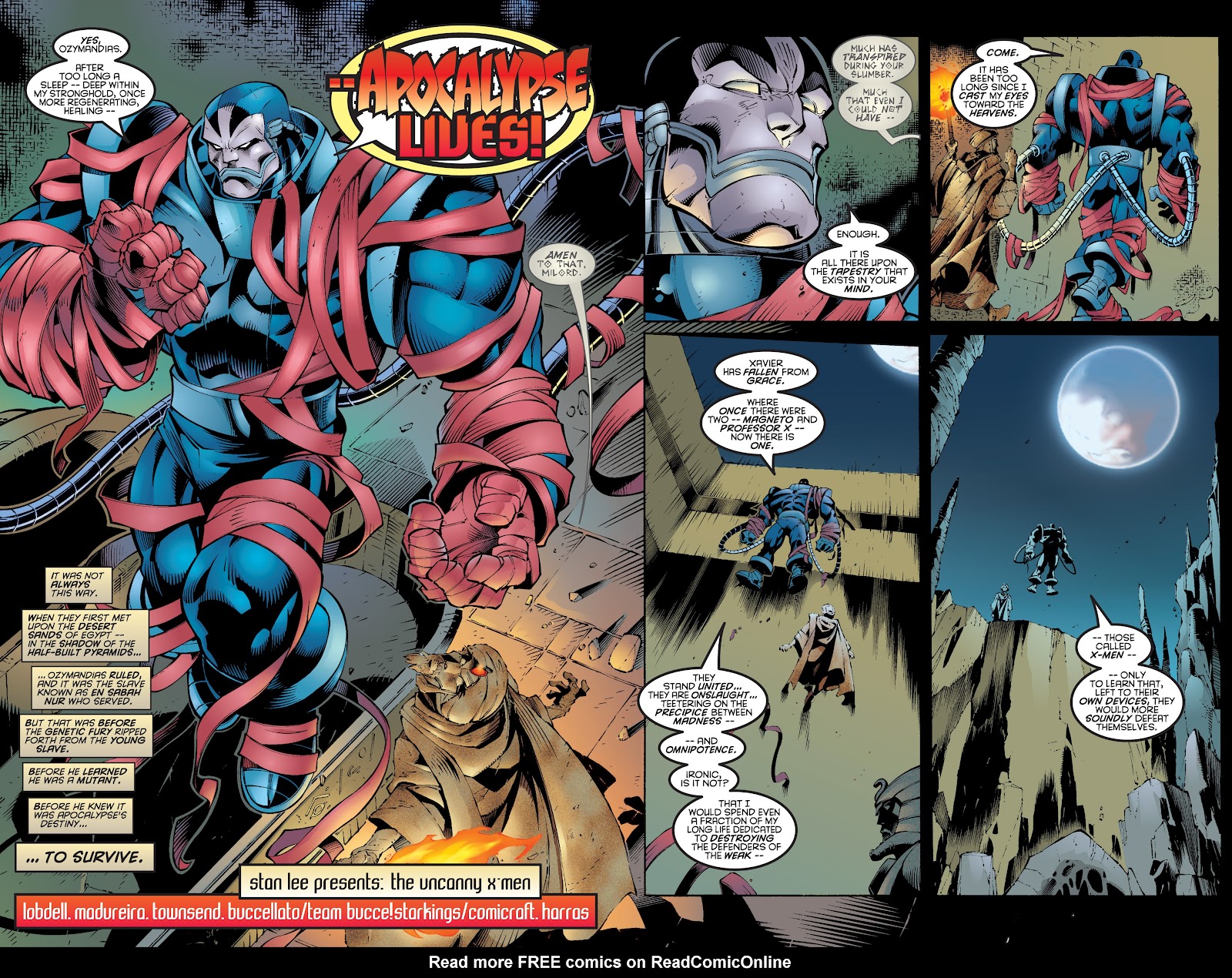Apocalypse, Mr. Sinester, Magneto, Onslaught, Proteus, Dark Phoenix, Cassandra Nova, Bastion, Sentinels, Phalanx, Juggernaut, Stryfe, Sebastian Shaw, Mystique, John Sublime, William Stryker, Los Brood, Sauron y Graydon Creed.