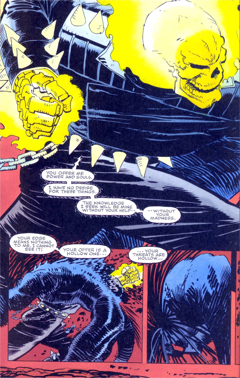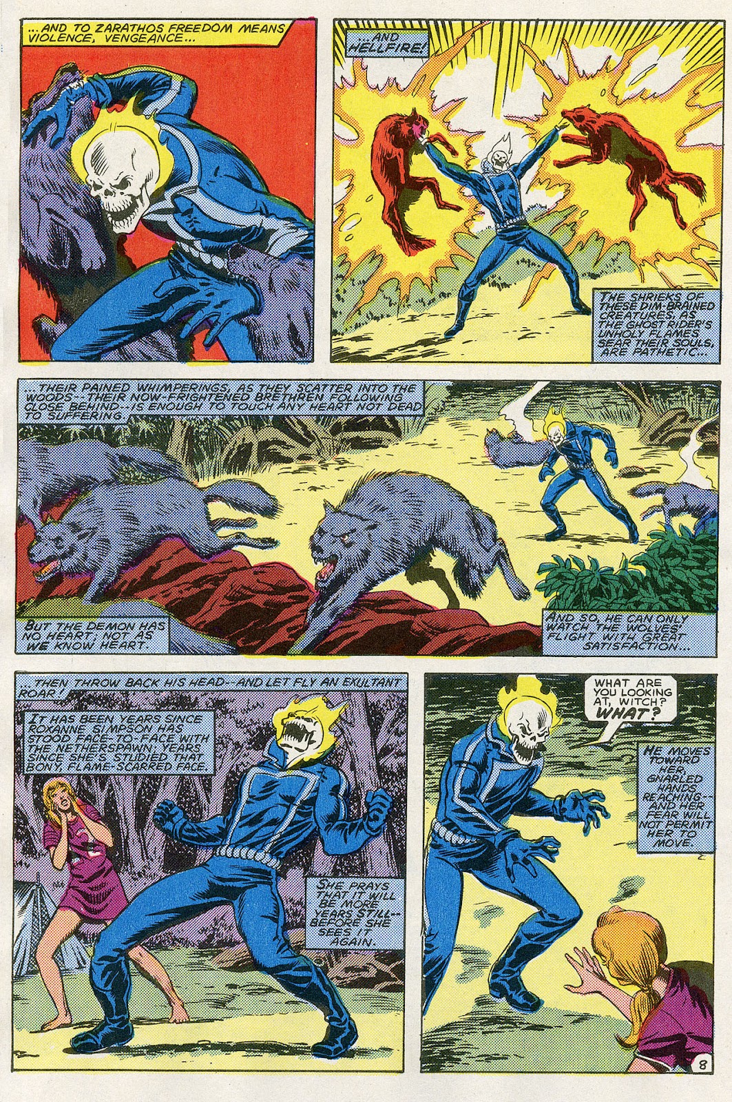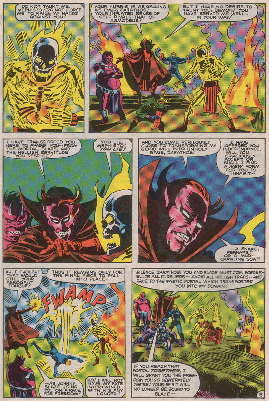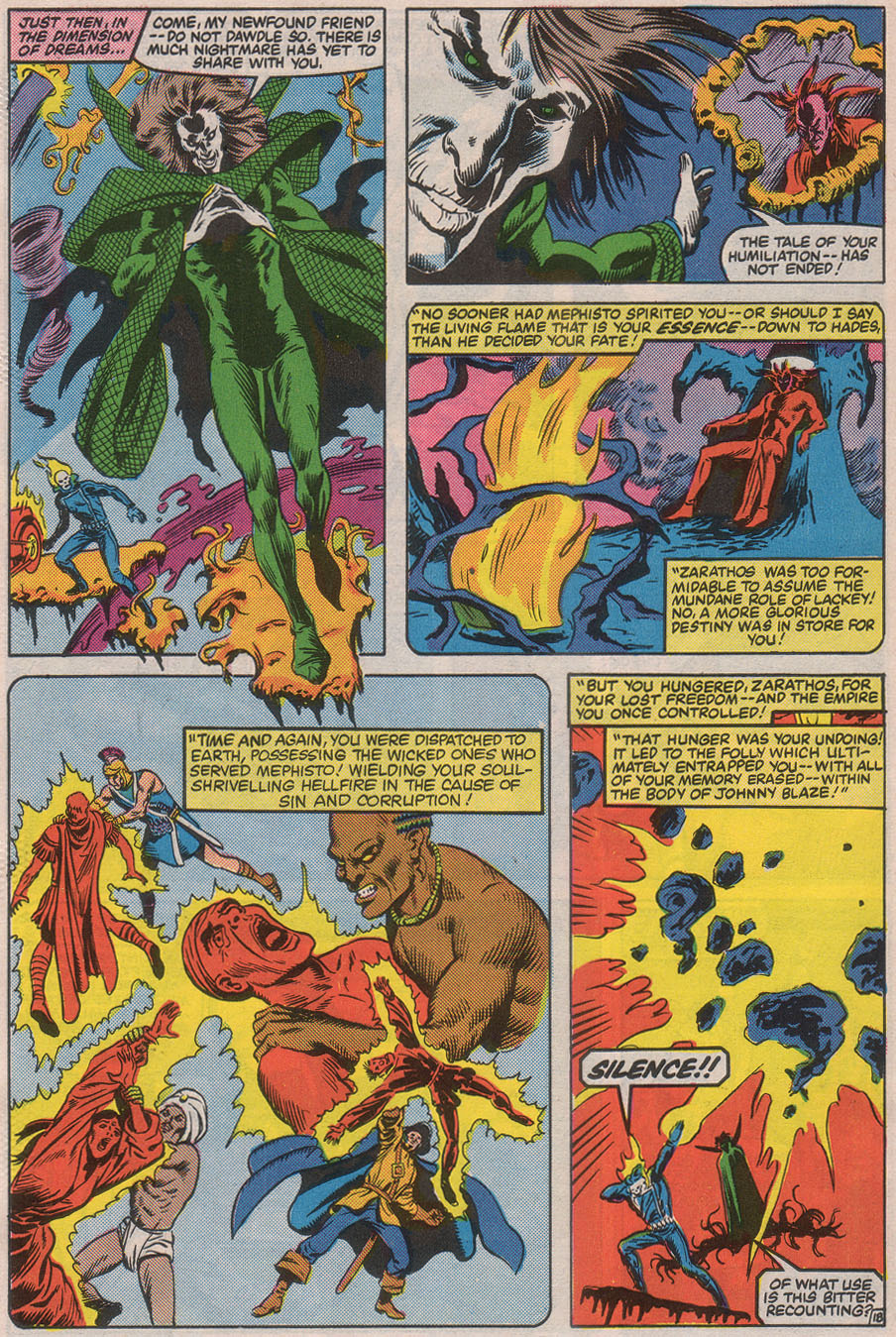 Zarathos: Originalmente era un demonio devorador de almas que fue invocado en la Tierra hace 2000 años por una tribu indígena, y en su auge logró incrementar su poder al ganar seguidores que le brindaban almas de víctimas y prisioneros en una escala masiva, lo que llamó la atención y los celos por parte de Mephisto, quien optó por tenderle una trampa y apoderarse de su esencia, condenándolo a vagar de alma en alma en el mundo mortal sobre los individuos que hacían pactos con los Lords del Infierno, hasta acabar en el cuerpo de Johnny Blaze y estar obligado a cederle parte de sus poderes. Sin embargo, solo Zarathos tiene acceso a su máximo nivel y puede manifestar su pleno poder cuando tiene control sobre el cuerpo del Ghost Rider sin interferencia de Johnny. Su dominio sobre el hellfire es ampliamente superior al de Blaze en todo aspecto.