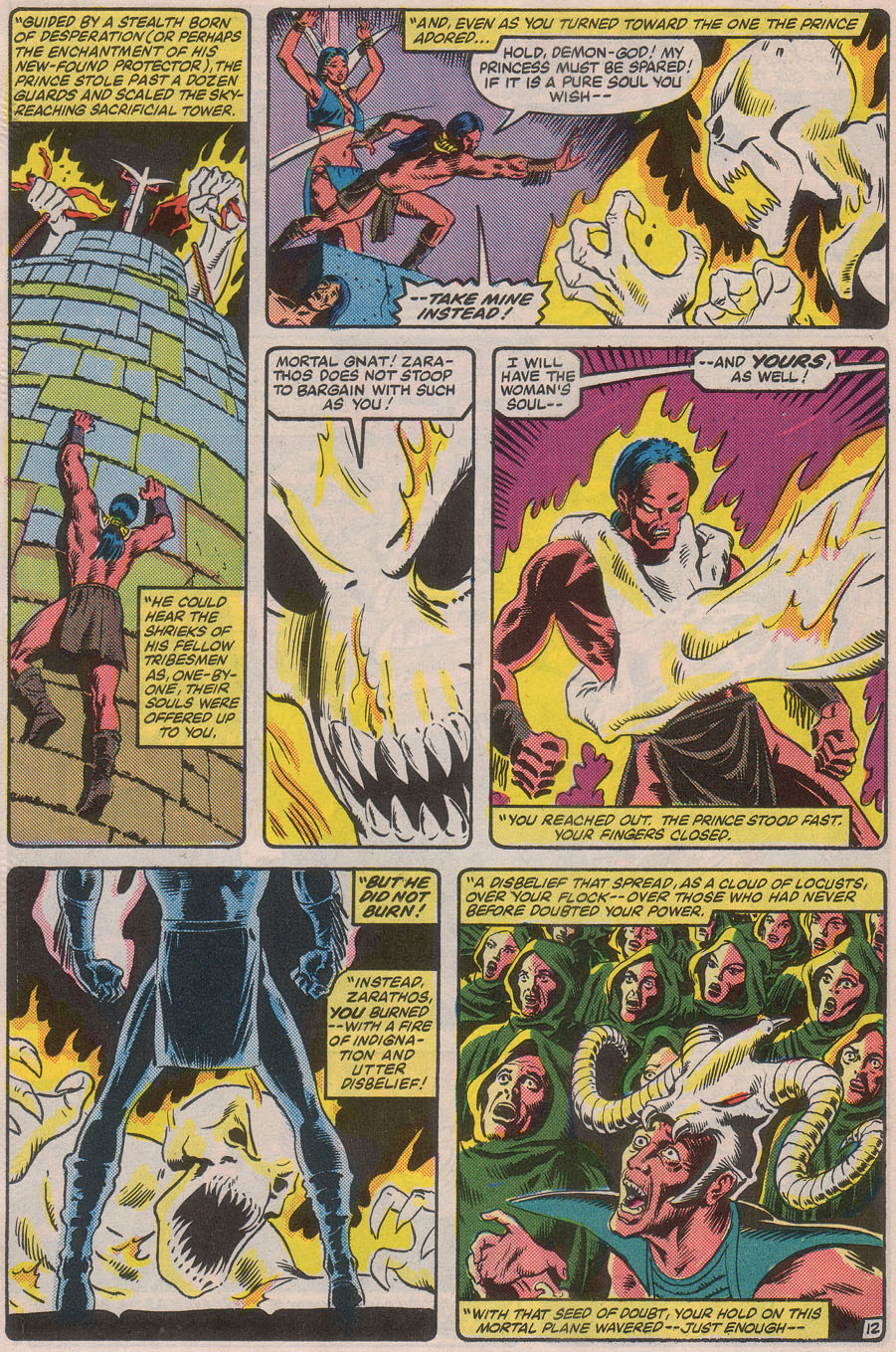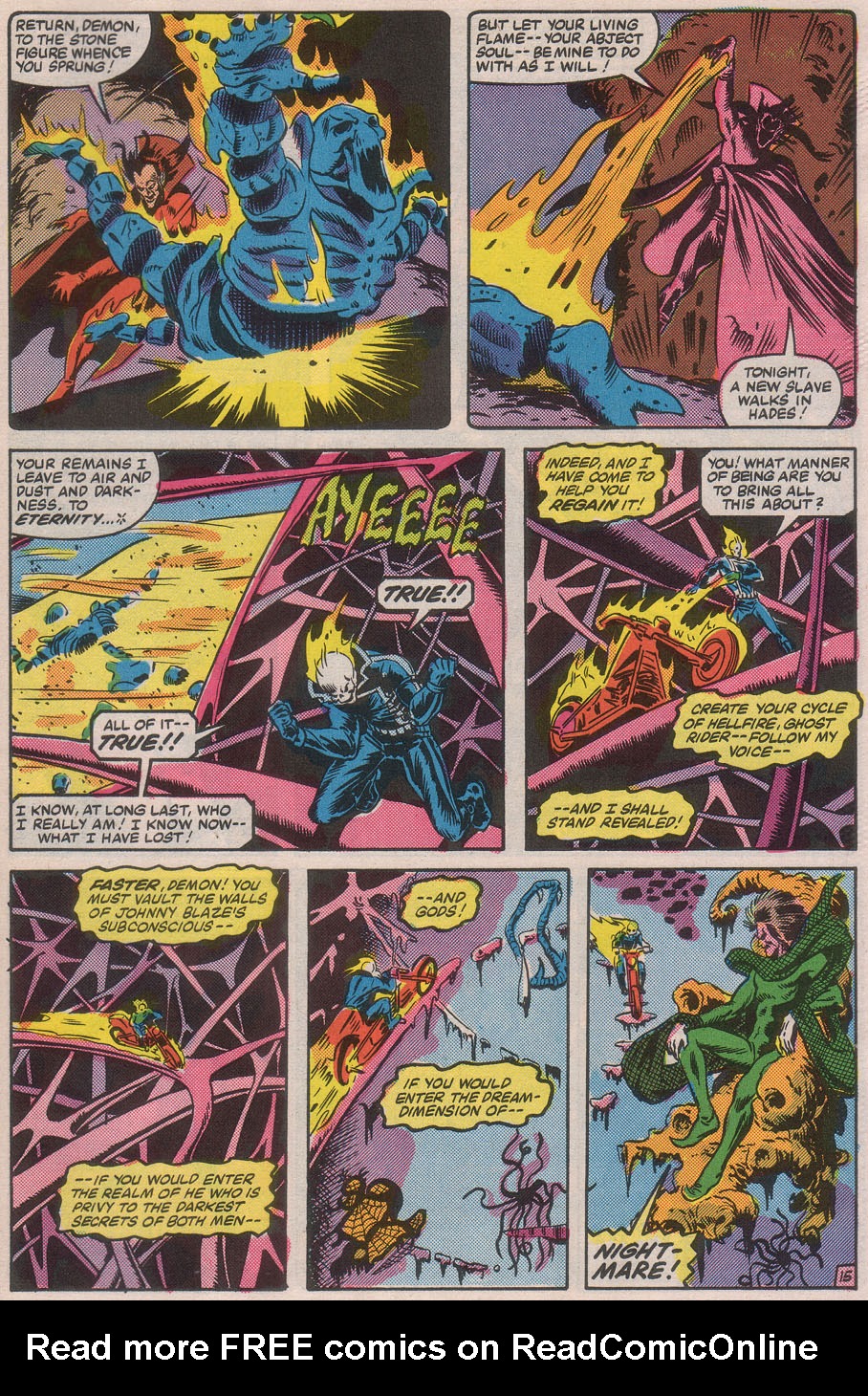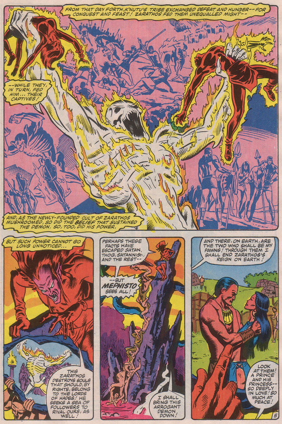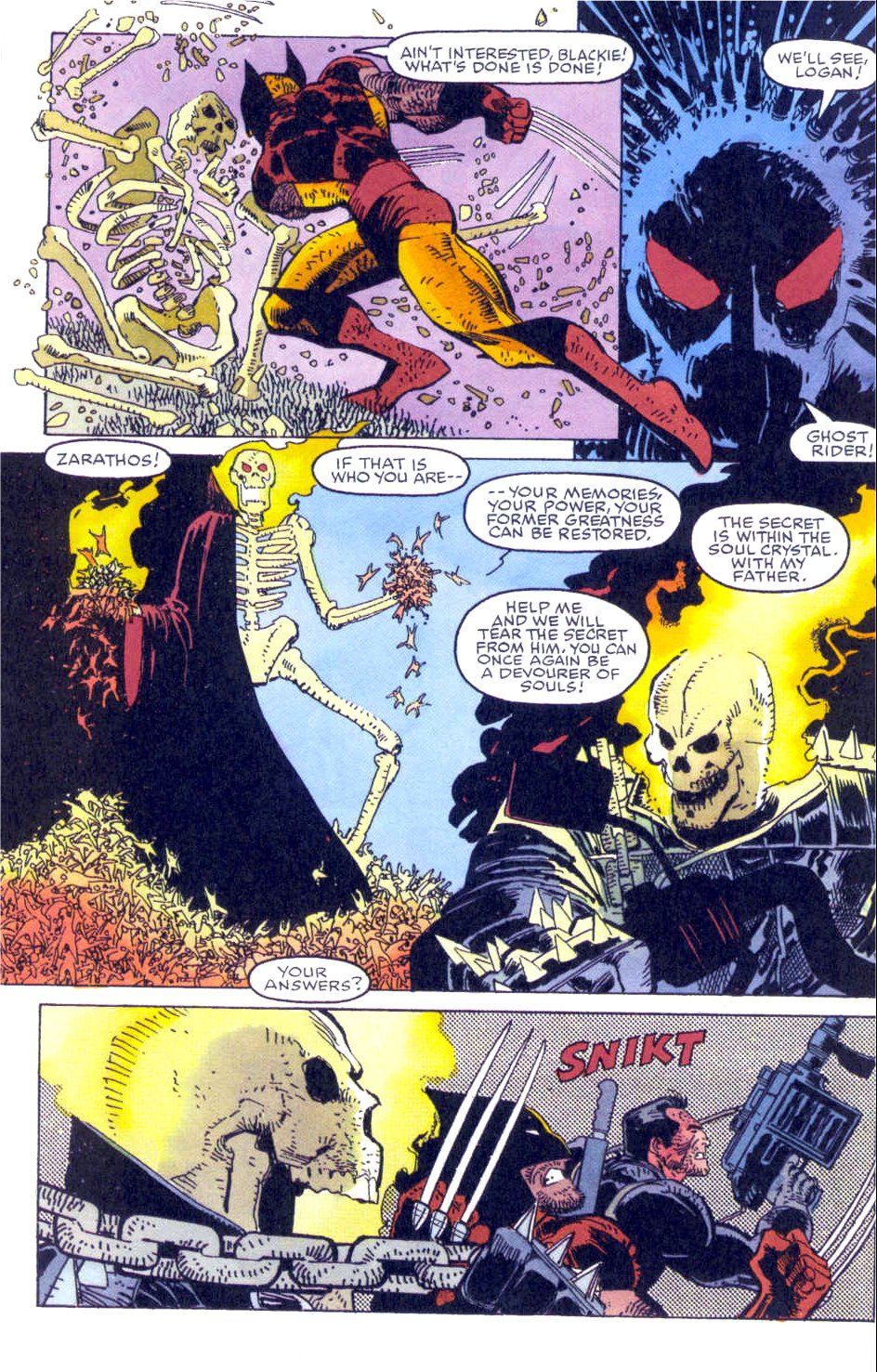 Zarathos: Originalmente era un demonio devorador de almas que fue invocado en la Tierra hace 2000 años por una tribu indígena, y en su auge logró incrementar su poder al ganar seguidores que le brindaban almas de víctimas y prisioneros en una escala masiva, lo que llamó la atención y los celos por parte de Mephisto, quien optó por tenderle una trampa y apoderarse de su esencia, condenándolo a vagar de alma en alma en el mundo mortal sobre los individuos que hacían pactos con los Lords del Infierno, hasta acabar en el cuerpo de Johnny Blaze y estar obligado a cederle parte de sus poderes. Sin embargo, solo Zarathos tiene acceso a su máximo nivel y puede manifestar su pleno poder cuando tiene control sobre el cuerpo del Ghost Rider sin interferencia de Johnny. Su dominio sobre el hellfire es ampliamente superior al de Blaze en todo aspecto.