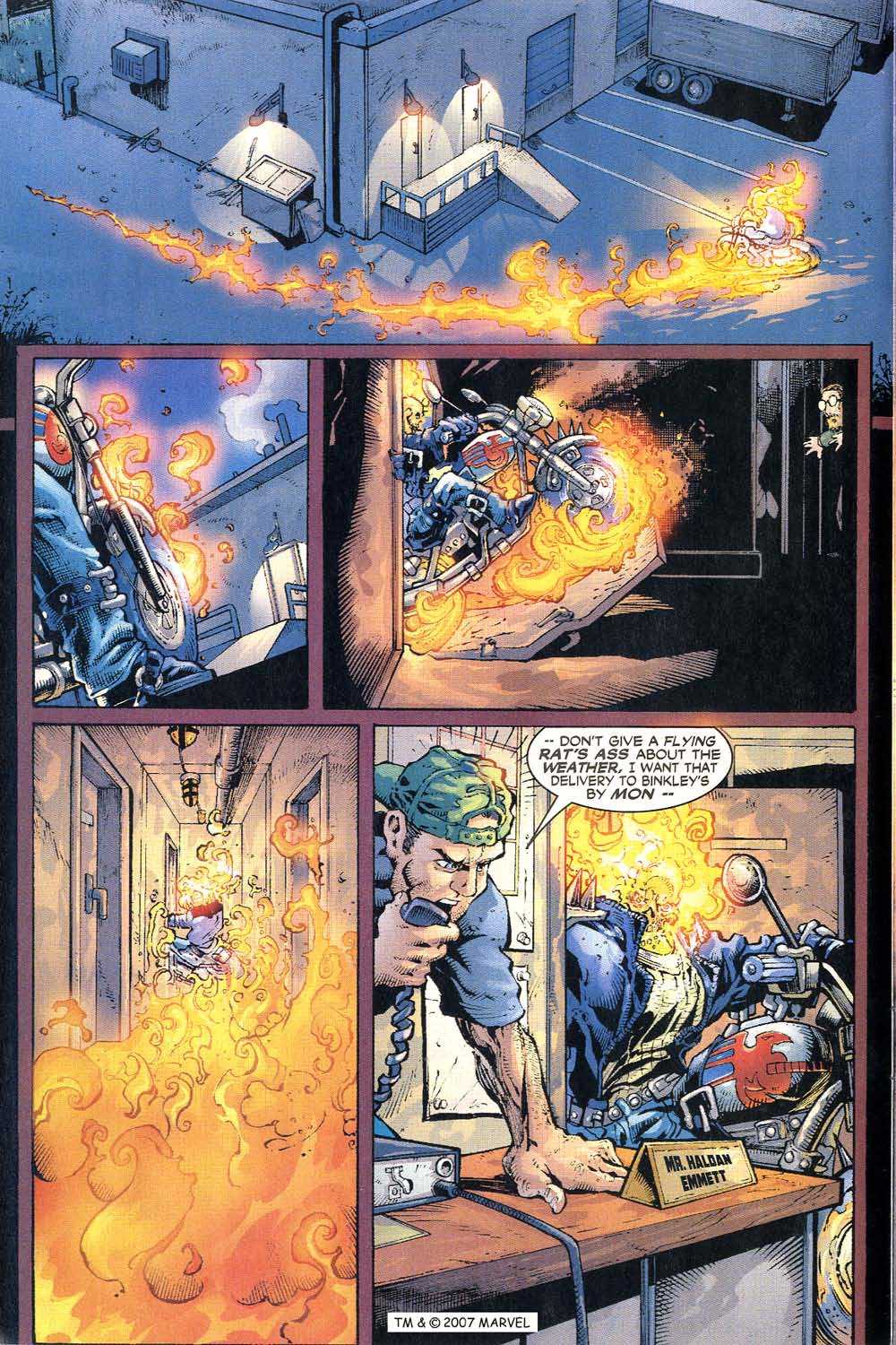 Velocidad: Reflejos sobrehumanos+ (Es capaz de maniobrar y hacer trucos con su motocicleta a 80 mph o 36 m/s, también a 200 mph o 89 m/s) | Reflejos supersónicos+ (Puede reflejar múltiples disparos con un movimiento de sus cadenas, también es capaz de atrapar una bala con su boca. Pudo reaccionar ante el disparo de un francotirador sin mayor dificultad. Es capaz evadir el impacto de un misil) | Reflejos hipersónicos+ (Es capaz de maniobrar su motocicleta en intervalos de tiempo como los microsegundos para amortiguar una gran caída) | Reflejos relámpago+ (Se menciona que posee unos reflejos tan rápidos como un relámpago. Es capaz de rivalizar en este aspecto aplicado en un combate cercano con La Mole. Puede evadir los rayos de energía de una copia exacta de Dr. Strange, el cual puede atacar con velocidad relámpago) | Velocidad sónica+ Desplazándose (Su motocicleta le permite alcanzar velocidades que lo vuelven imperceptible para otros conductores. Encontrándose a cien millas de la civilización, Johnny fue capaz de cruzar toda esa distancia en un par de horas. Puede alcanzar la velocidad de 100 mph en múltiples ocasiones sin muchos problemas, también ha logrado alcanzar los 200 mph de forma casual. Fue capaz de recorrer 20 millas o 32 km en cuestión de un par de minutos) | Masivamente