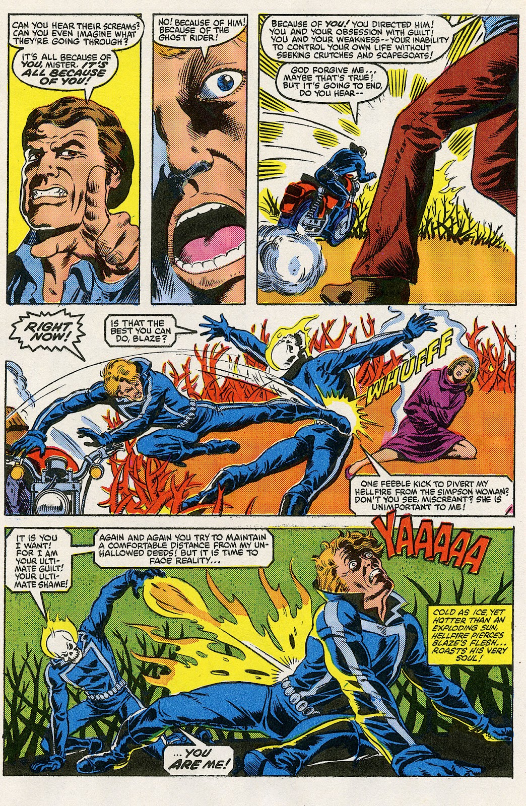 Debilidades: Su cuerpo es especialmente vulnerable ante cualquier arma forjada con materiales del Cielo. Su hellfire no afecta a individuos que carezcan de un alma, la Mirada de Penitencia no funciona frente a individuos con una mente muy trastornada o de plano si el oponente es ciego. Si un Ghost Rider llega a ser asesinado su espirítu buscará un nuevo portador y tendrá una nueva identidad.