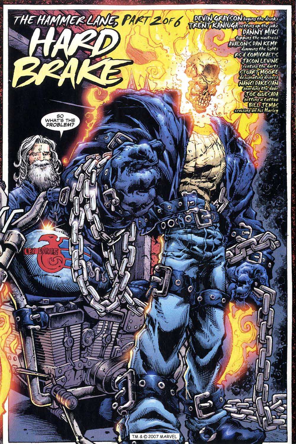 Fuerza (de choque y levantamiento): Atleta+ (En su forma humana posee un porte físico de talla olímpica a causa de años de entrenamiento) | Muro+ (Utiliza su fuerza para partir unas cadenas y estrellar a un demonio con un contenedor de madera. Puede arrancar las cabezas de dos personas poseídas utilizando sus cadenas, también ha sido capaz de levantar y mandar a volar autos con ellas. Es capaz de derribar puertas de madera con una patada, triturar autos con sus manos, levantar un auto y arrojarlo con facilidad. Pudo partir una chimenea con el movimiento de su brazo, atravesar muros de concreto o arrancar una puerta reforzada de acero con sus manos. Es capaz de levantar un par de toneladas de aparatos electrónicos) | Estructura+ (Al batallar con personas poseídas es capaz de arrancar extremidades de sus cuerpos o invocar sus flamas mediante sus manos para generar explosiones grandes. Utilizando sus cadenas y la fuerza de sus brazos pudo arrancar la parte frontal de un avión para detener su marcha) | Multi-estructura+ (Utilizando sus cadenas y aplicando la fuerza de sus brazos fue capaz de colapsar y derribar todo un rascacielos sobre Hulk. Valiéndose de la potencia de su motocicleta unida a sus cadenas pudo levantar un tren directo desde el subterráneo. Puede mantener un combate cuerpo a cuerpo con el Capitán América) | Superior+ (Mientras canalice e infunda su hellfire hacia sus extremidades o armas con tal de incrementar su potencia al mismo nivel que su Poder Destructivo) | Multi-galáctica+ (Como Zarathos, estando debilitado fue capaz de enfrentar a Mephisto en un combate sin precedentes aunque al final terminaría siendo derrotado por este) | Multi-galáctica+ (Como Angel Rider, se hace referencia a que batalló directamente con el World War Hulk. Todos los Ghost Rider en su pleno potencial tienen acceso a una fracción del poder de Dios y el poder conjunto de todo el grupo podría ser capaz de acabar con el plano existencial del Cielo)