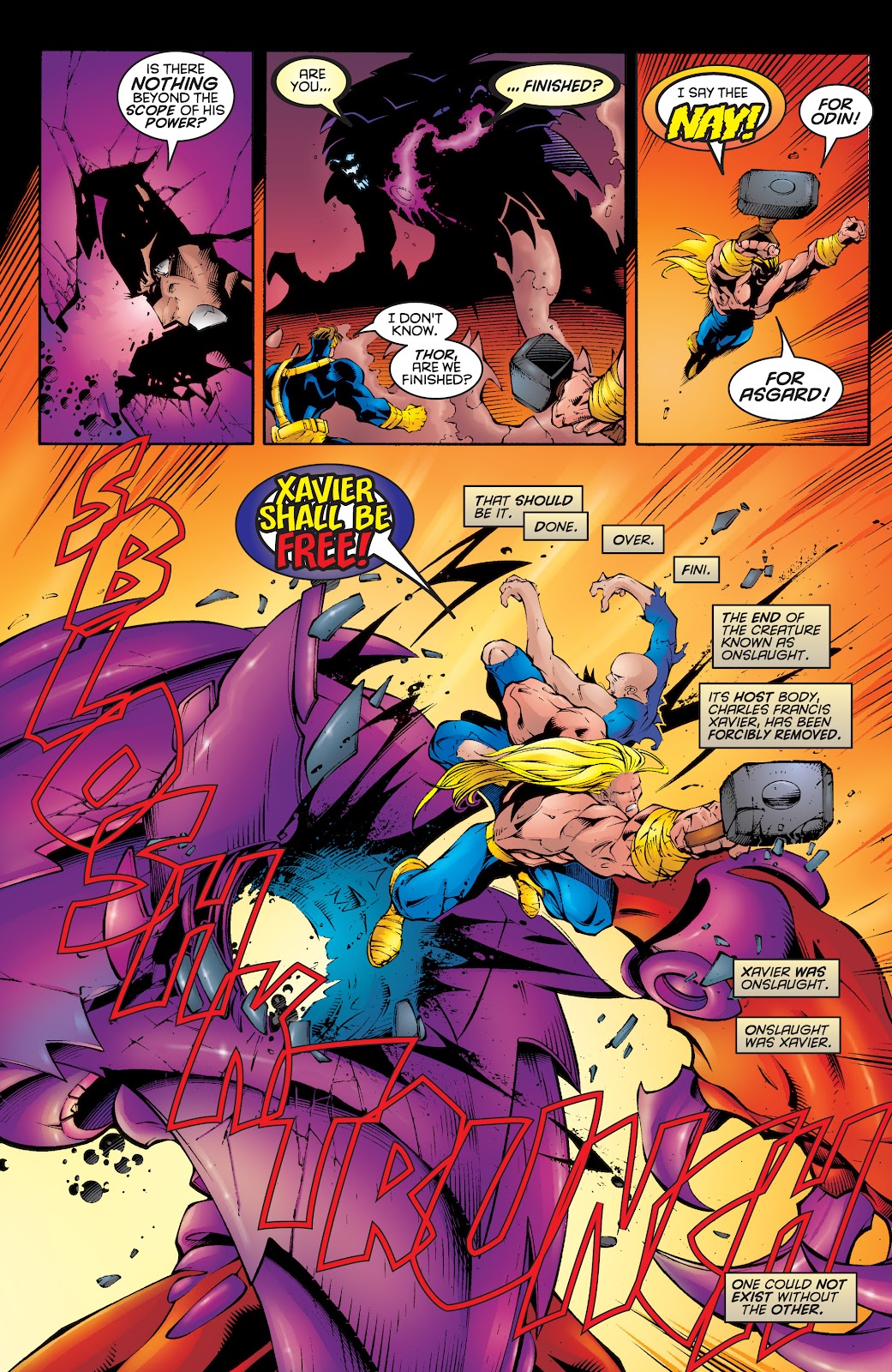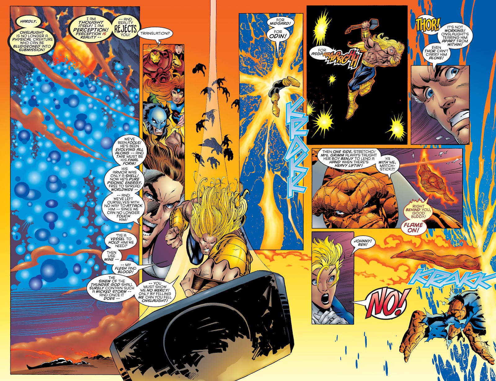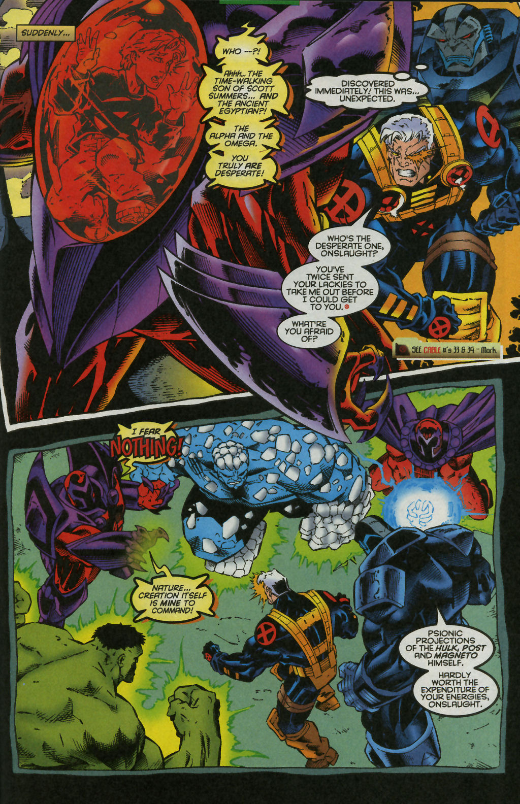 Nacido accidentalmente de los pensamientos más oscuros de Charles Xavier más la influencia de los deseos genocidas de Magneto en su subconsciente, esta criatura hecha de pura energía psiónica tomaría posesión de la mente del Profesor X y se convertiría en una de las amenazas más grandes que haya pisado el universo Marvel. Con el único objetivo de poseer el poder más grande que haya existido y exterminar tanto a humanos como mutantes por igual, él tendrá que derrotar a los seres más poderosos de la Tierra: Es el Indomable Onslaught!