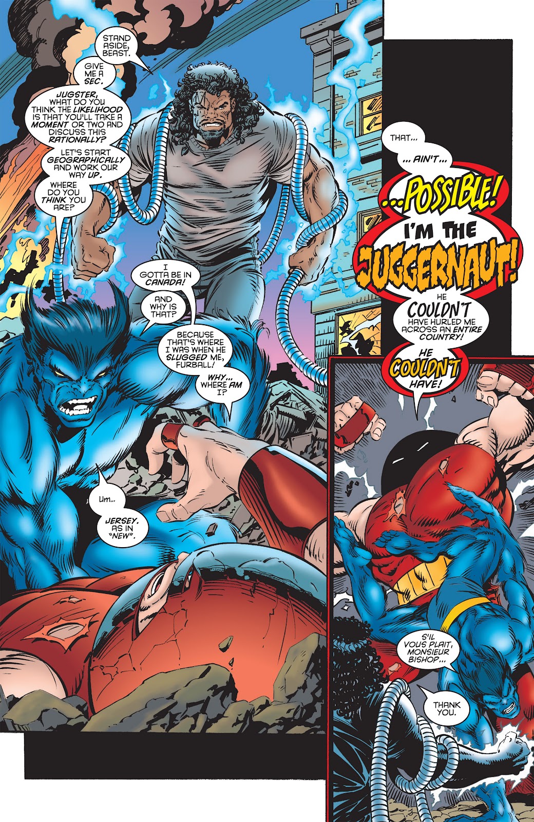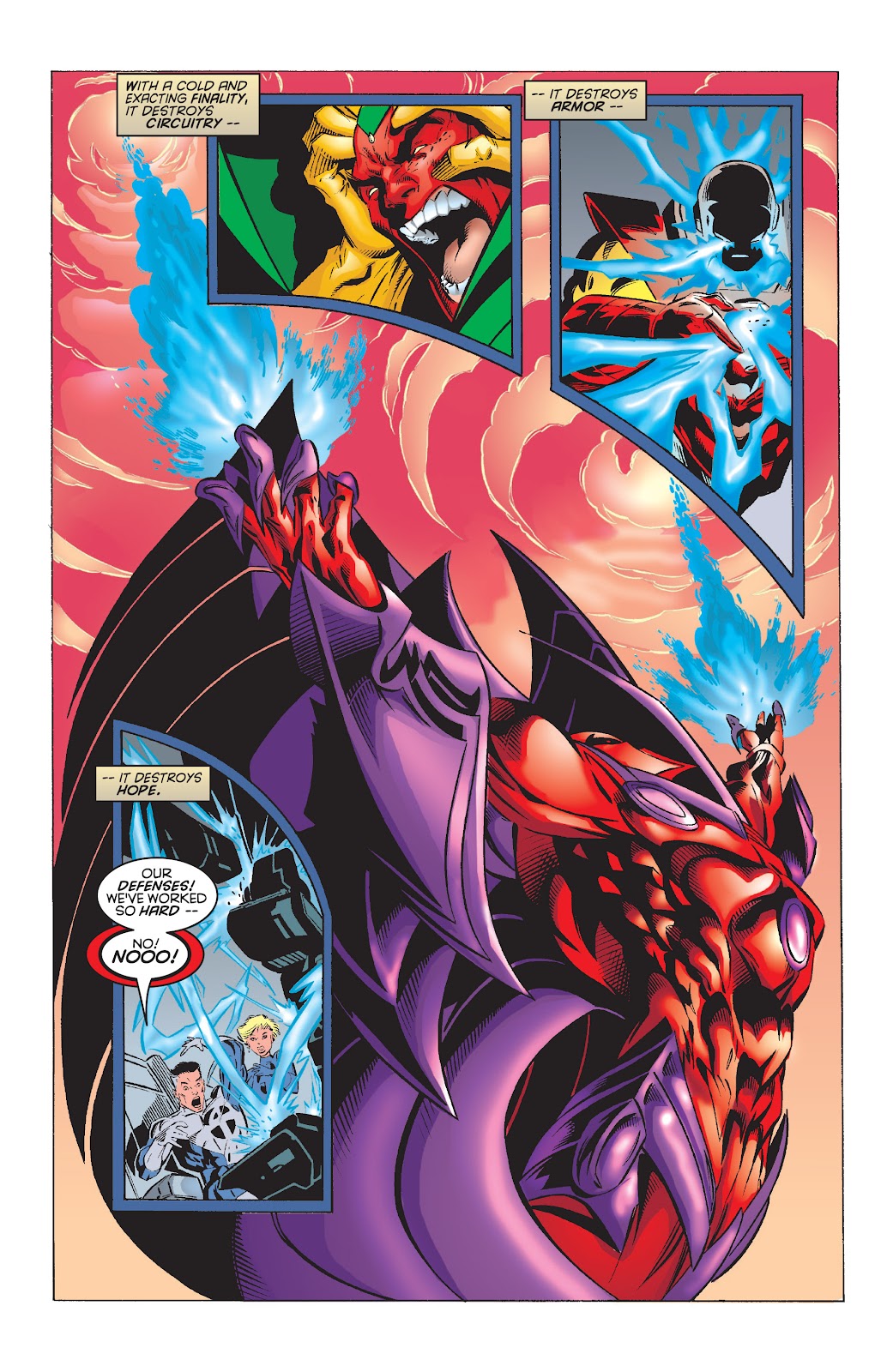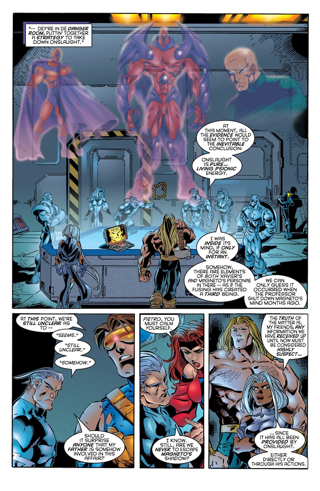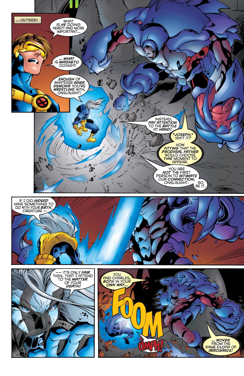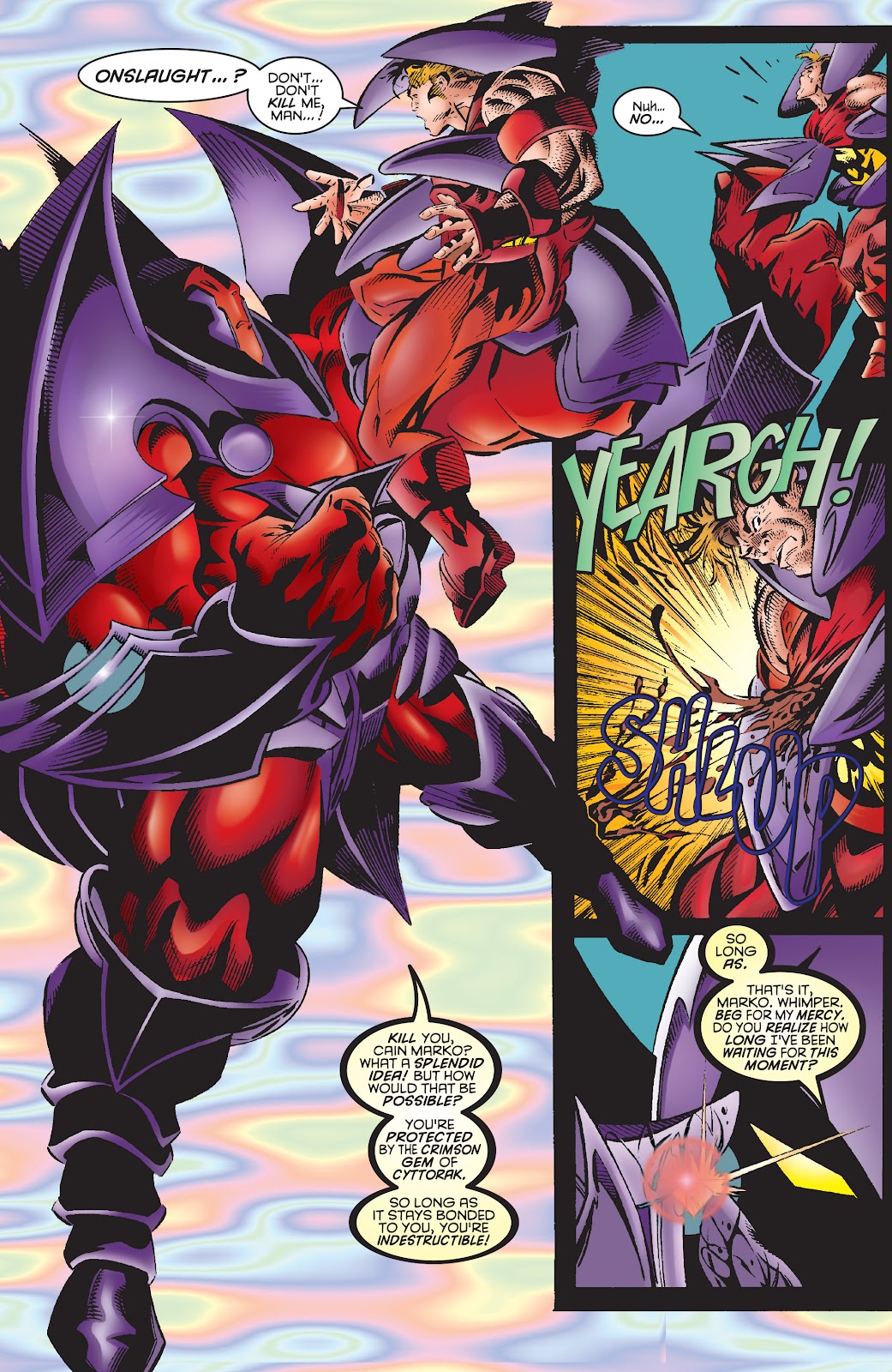 Poder destructivo: Semi-ciudad+ (Utilizando el mínimo de su poder hubiera sido capaz de incinerar secciones de una ciudad instantáneamente) | Multi-planetario+ (Se menciona que podría destruir la Tierra sin problema alguno. Es capaz de superar y derrotar con un solo ataque a Joseph, un clon con la misma capacidad de Magneto) | Multi-estelar+ (Se menciona que posee el poder suficiente como para destruir estrellas de forma casual) | Multi-galáctico+ (Peleando en serio logró derrotar al Juggernaut con un solo golpe fulminante y mandarlo a volar directo a otro país. Estando furioso casi logró matar a Thor y otros héroes con una onda expansiva de energía psiónica. Se menciona que hasta el propio Uatu The Watcher reconoce el máximo poder de Onslaught y teme de él, y como referencia, Uatu posee el suficiente poder como para destruir planetas y exterminar galaxias) Nivel universal+ (Como Omega Onslaught, pudo mantener un combate cuerpo a cuerpo con un Hulk Furia Máxima, del cual previamente se le había apagado la conciencia de Banner para liberar todo el poder posible. La destrucción de su armadura liberó un poder tan grande que pudo dejar fuera de combate a ese Hulk y desestabilizarlo atómicamente| Multi-universal+ (Como Omega Onslaught, con una fracción de la alteración de la realidad de Franklin Richards era capaz de tener un control sobre toda la realidad y se mencionaba que era una amenaza universal, también se decía que podía reformar todo el universo a su merced. Progresivamente se hacía más poderoso al ir absorbiendo el poder de Franklin y se presume que lograría alcanzar el nivel de este último, y como referencia, Franklin niño tenía la suficiente capacidad como para recrear a Galactus en su máximo poder a costa de utilizar hasta la última gota de su energía. Como dato extra, también pudo crear estrellas con la alteración de la realidad) | Su alteración de la realidad ignora por completo la resistencia física. | Su alteración de la realidad le permite teletransportar a sus oponentes entre dimensiones.