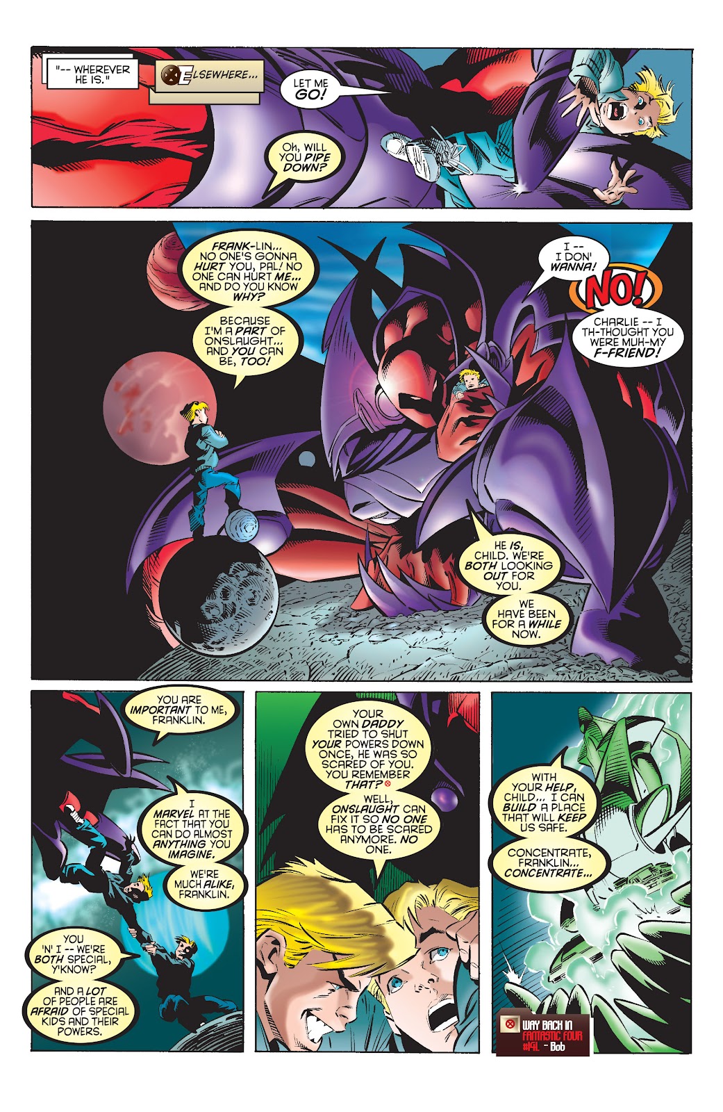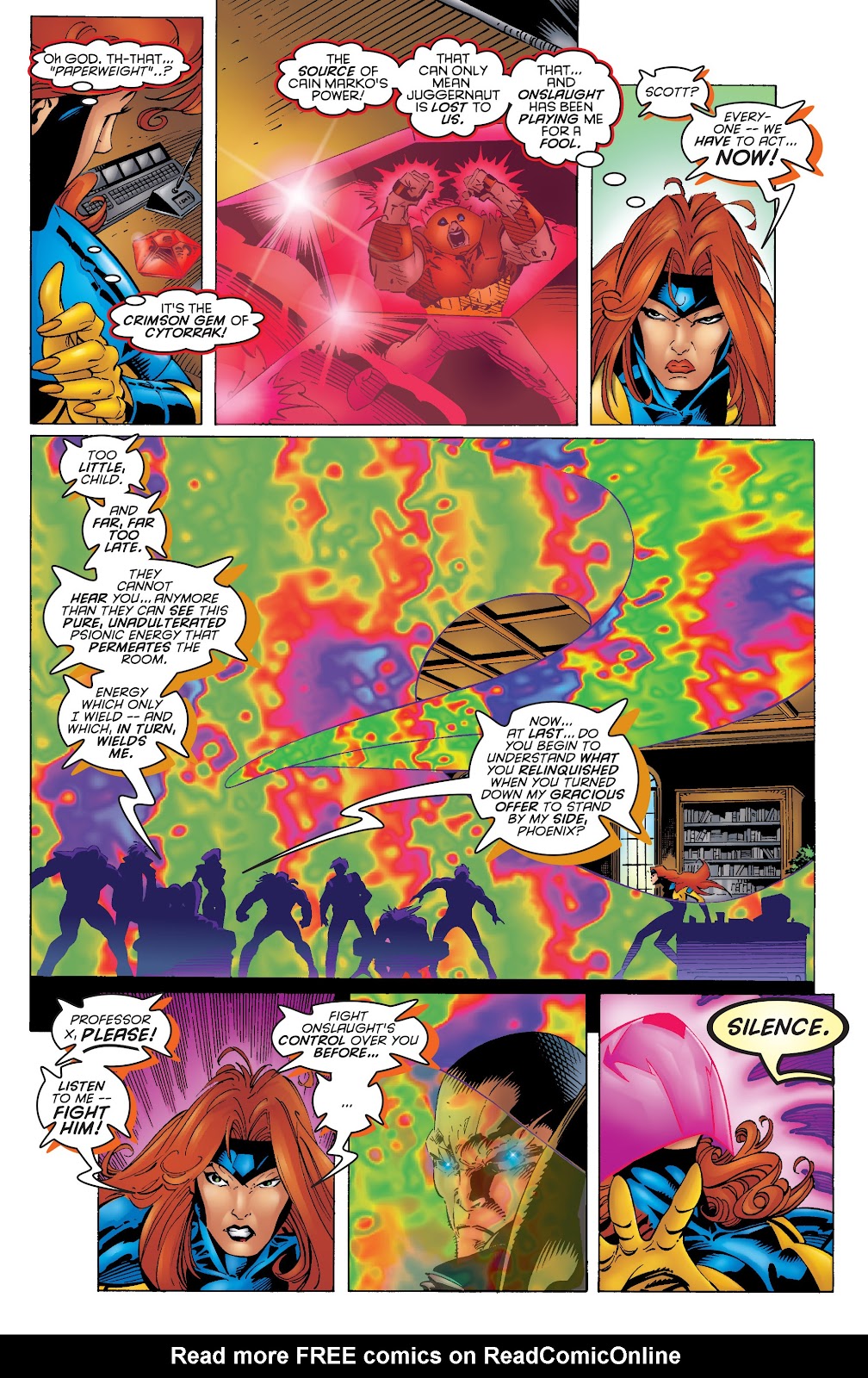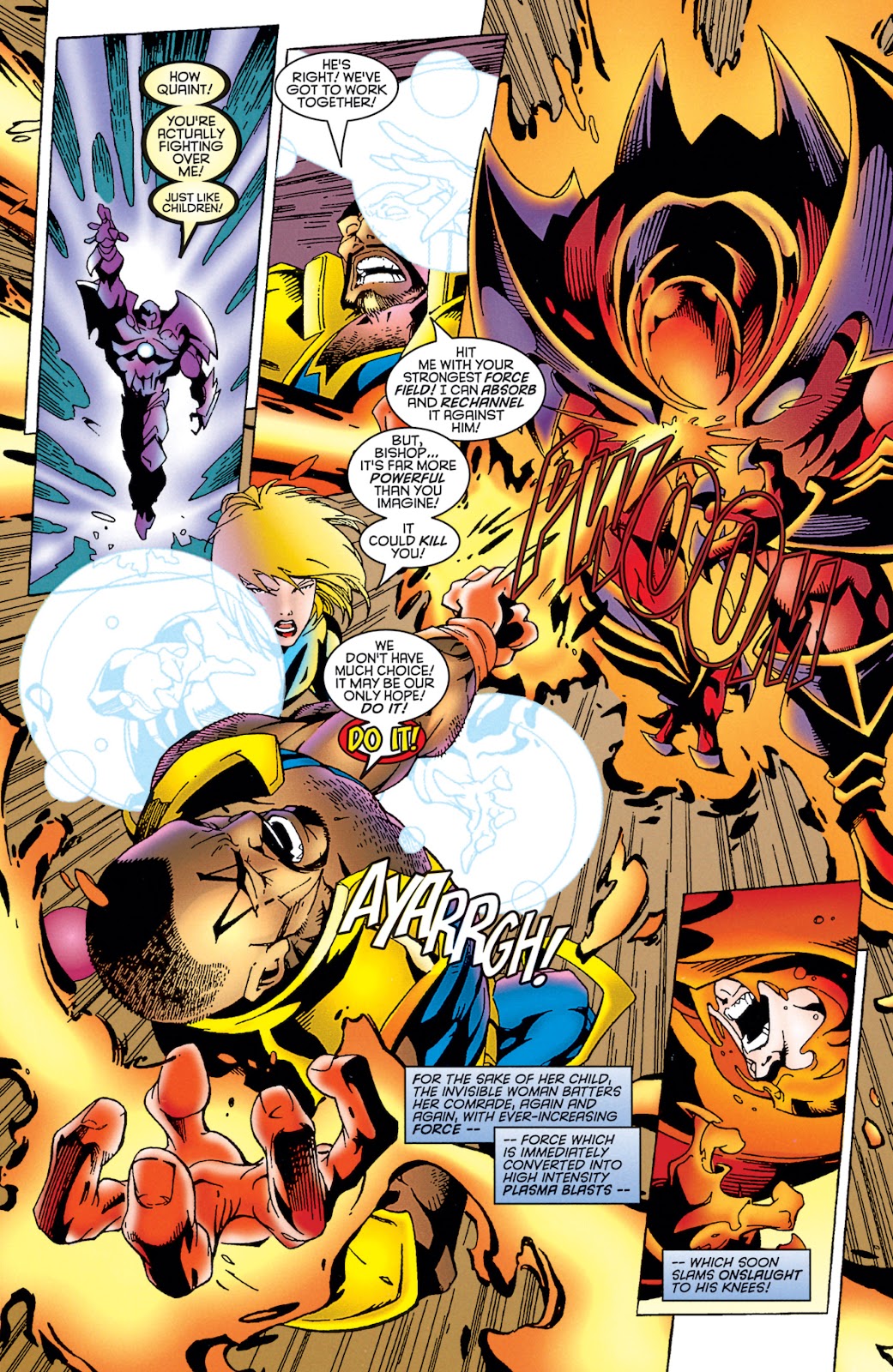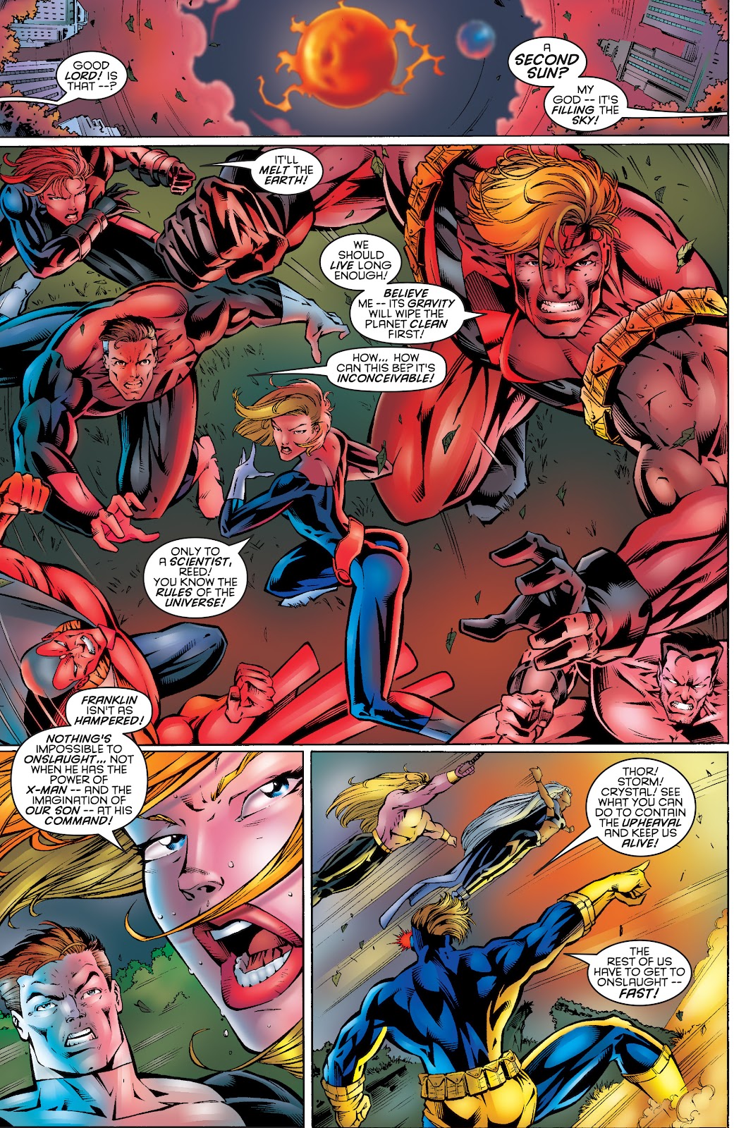 Omega Onslaught: Es el resultado de Onslaught adquiriendo los poderes de Franklin Richards al utilizarlo como contenedor de energía y posteriormente robar los poderes psiónicos del joven Nate Grey. En este estado todos los atributos físicos de Onslaught son incrementados notablemente y adquiere nuevas habilidades a una escala cósmica, siendo su evolución final una forma incorpórea hecha de pensamientos que no puede ser destruida pero sí contenida con los medios adecuados.