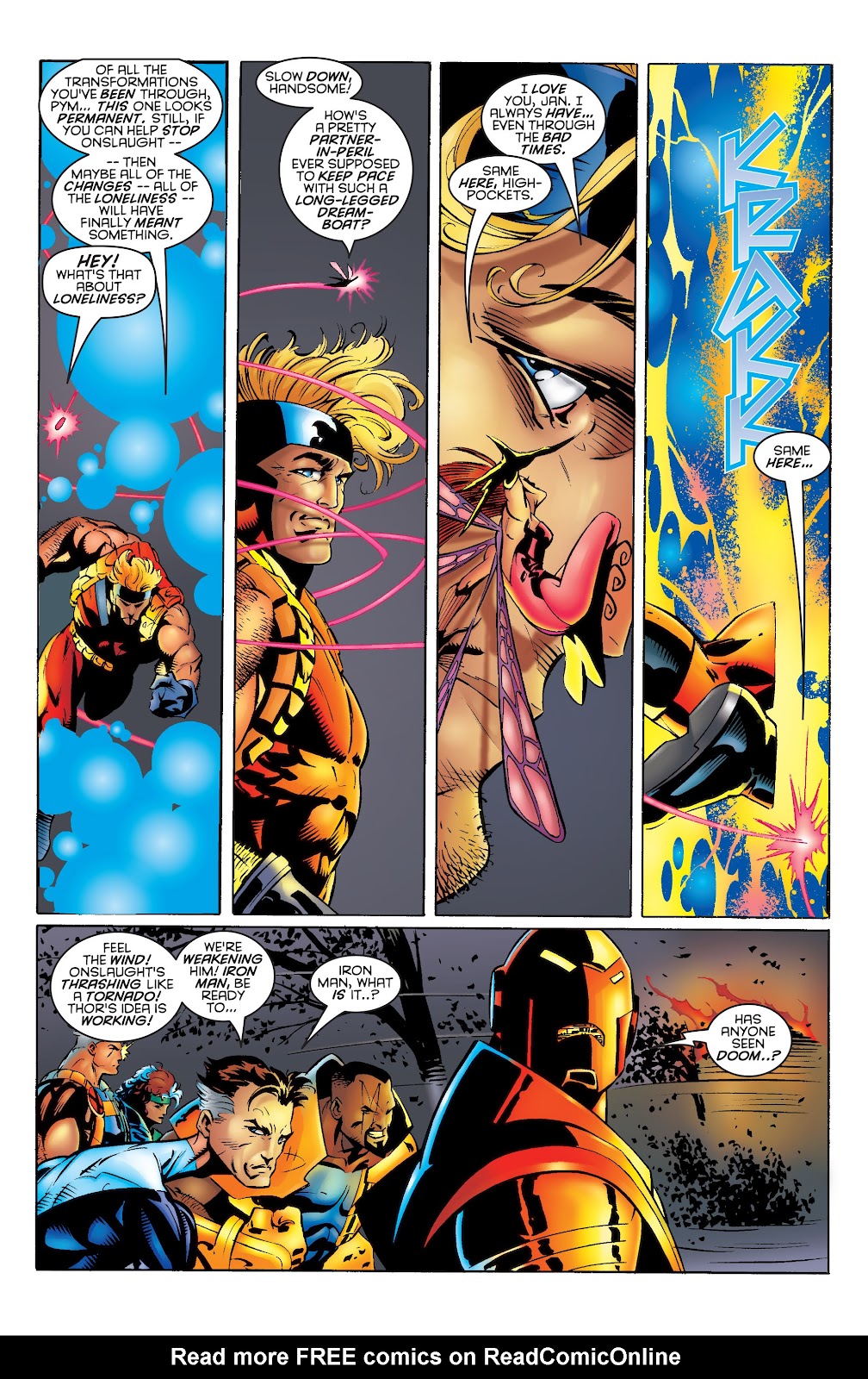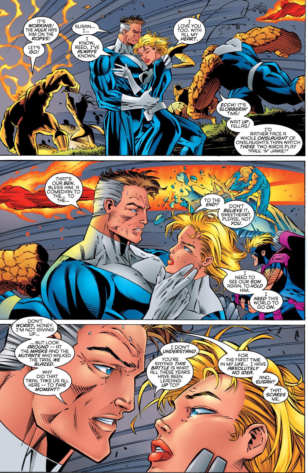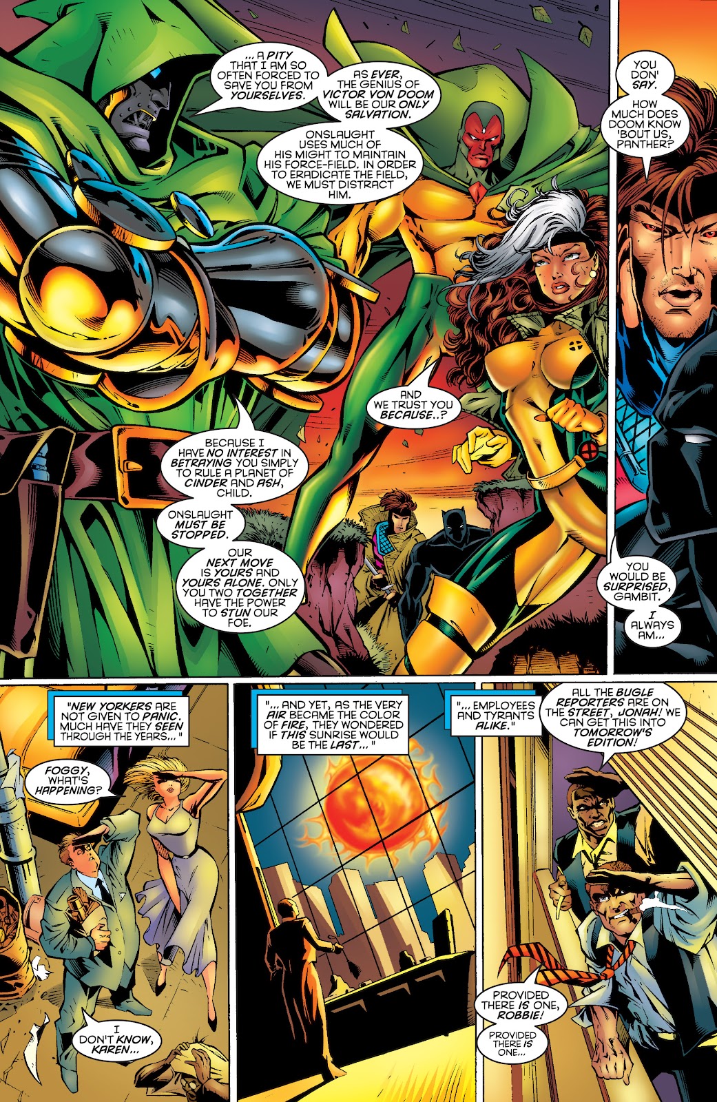 Omega Onslaught: Es el resultado de Onslaught adquiriendo los poderes de Franklin Richards al utilizarlo como contenedor de energía y posteriormente robar los poderes psiónicos del joven Nate Grey. En este estado todos los atributos físicos de Onslaught son incrementados notablemente y adquiere nuevas habilidades a una escala cósmica, siendo su evolución final una forma incorpórea hecha de pensamientos que no puede ser destruida pero sí contenida con los medios adecuados.