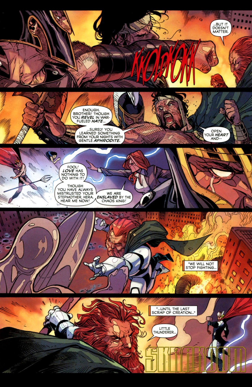 NOTA - En el arco de Chaos War, lo único que hizo el Chaos King fue revivir a Zeus (y a otros dioses poderosos) y controlarlos mentalmente para que estén bajo su disposición, pero en ningún momento se menciona que los hizo más fuertes o los empoderó de alguna forma. De hecho, en la misma historia confirman que solo están siendo manipulados más sus habilidades y niveles de poder siguen estando en su nivel habitual. Cabe destacar que aquel Zeus resucitado no estaba a su tope de poder ya que la esencia de su Thunderbolt había pasado a manos de Hera y luego Athena.