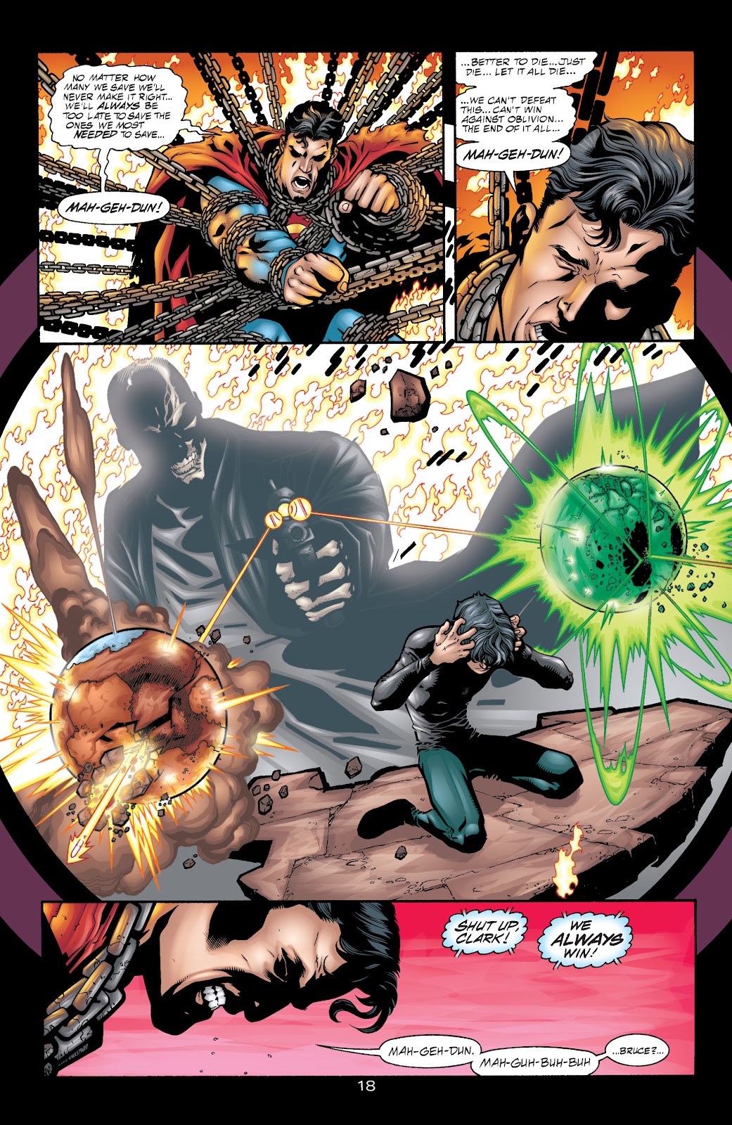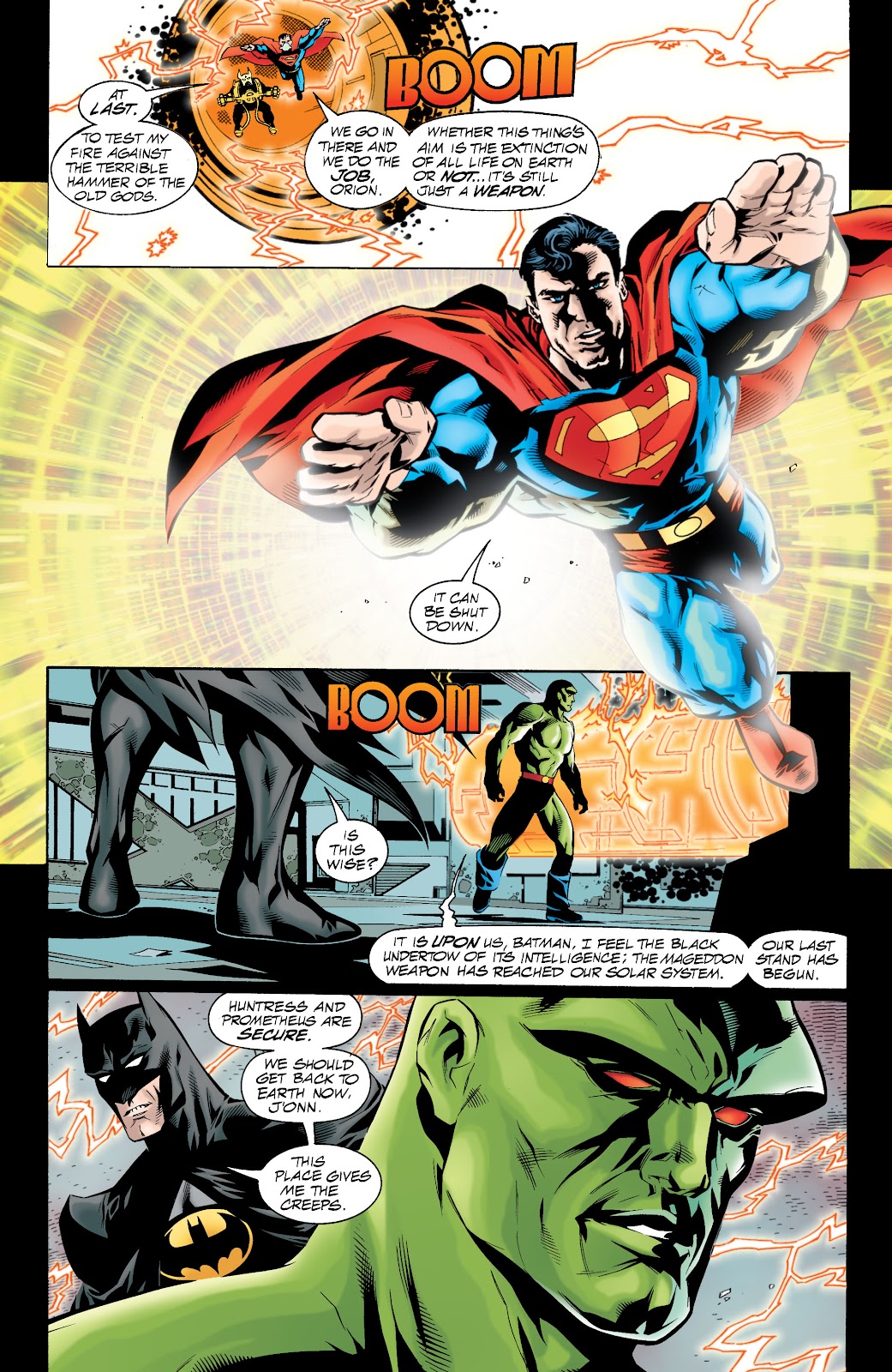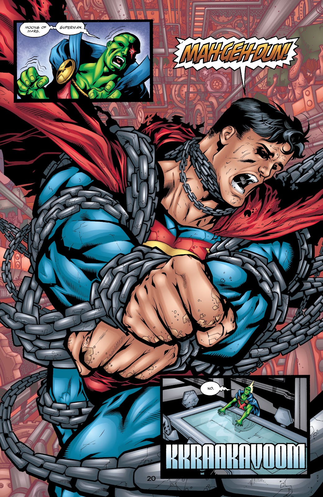 En el arco de World War Three, el antagonista principal fue un arma antiquísima de porte divino conocido como Mageddon, una nave de guerra autómata con un tamaño decenas de veces superior a una estrella. El superhéroe Aztek menciona que el funcionamiento interno de la nave consiste en aprisionar el alma de multitud de individuos que cumplan el rol de sustentar su cerebro mecánico y activar los mecanismos a través de pensamientos. Superman y Orion decidirían aventurarse en el interior de la nave para intentar apagarla, solo para enterarnos posteriormente por el escaneo de Martian Manhunter que Superman había sido capturado y aprisionado por la nave. Y efectivamente, Mageddon había convertido a Superman en uno de sus componentes para utilizarlo en contra de los héroes, pero realmente no hay hazaña de fuerza en este contexto, siendo que Mageddon de casualidad había atrapado a Superman para utilizarlo como fuente de energía adicional y que con o sin él de todas formas hubiera continuado su ataque a la Tierra. Superman solo estaba tratando de liberarse de las cadenas que lo sometían mientras Maggedon se aprovechaba de él y lo torturaba mentalmente, así que en esta situación no hay hazañas para el Hombre de Acero.