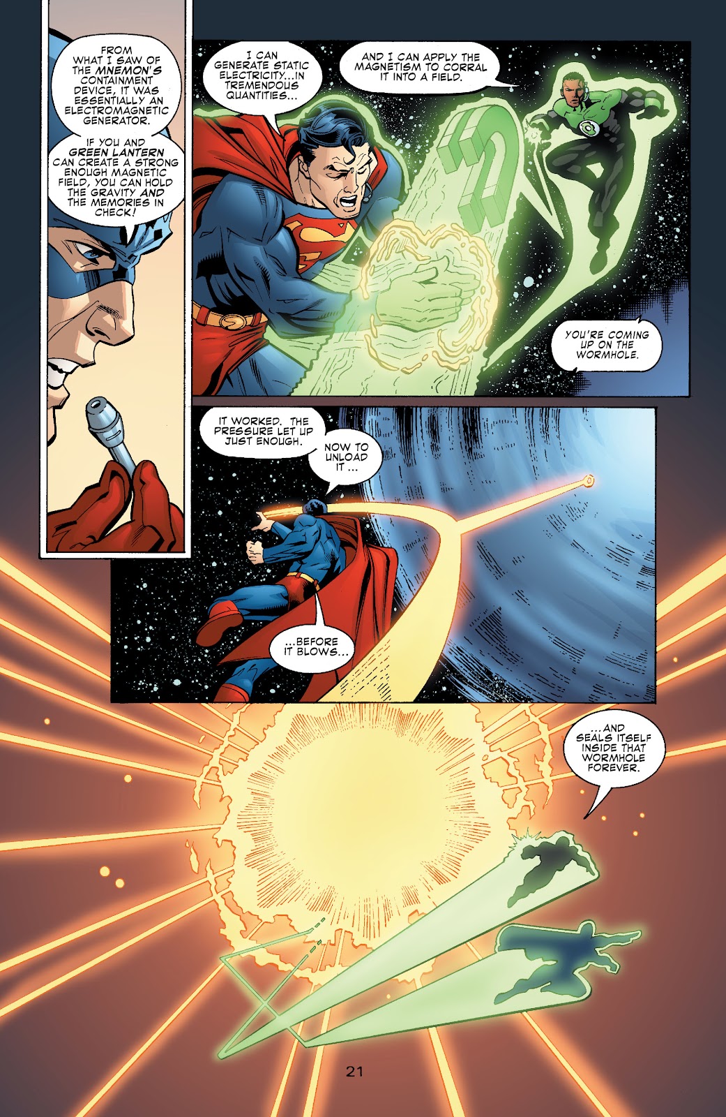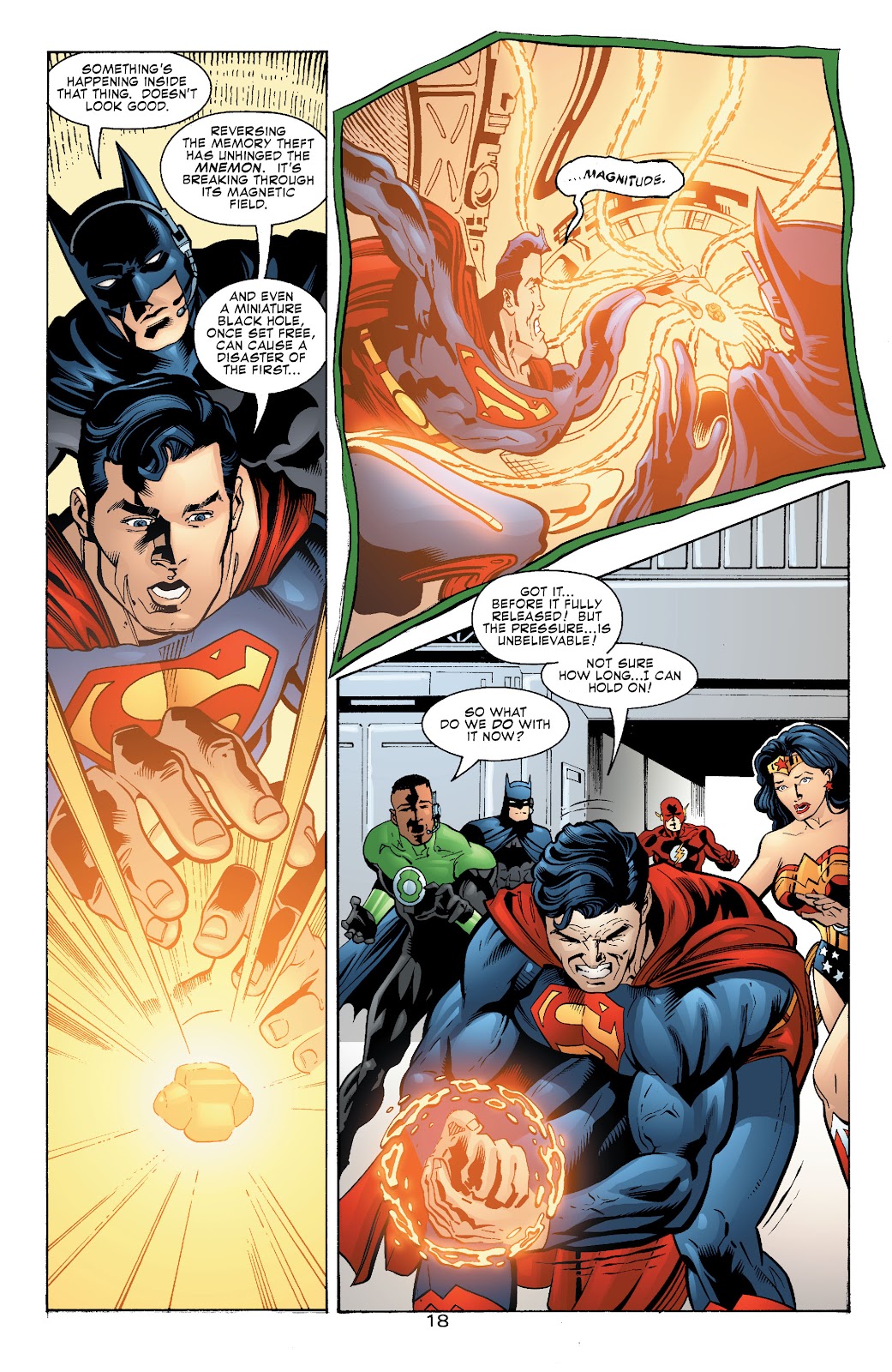 En en Long Run de la JLA 77, primero se nos presenta la creación de un aparato que contenía a un agujero negro sintetizado y anulaba su atracción gravitacional. John Stewart y Atom se encontraron dicho aparato en la luna y se dispusieron a analizarlo, resultando que dicho agujero negro no era más grande que una partícula de polvo gracias a que estaba contenido por un campo magnético y que si por algún motivo se liberaba de este entonces todo el sistema solar iba a ser destruido. La cosa es que al final el campo magnético terminaría sufriendo una rasgadura y el agujero negro estaba a punto de liberarse, pero justo antes de que lo lograra Superman cubriría la fisura con sus manos para intentar sellarlo. Aclaremos una cosa, Superman logró cubrir la fisura antes que el agujero negro se liberase, por lo que realmente solo está contrarrestando la presión de ese mini-agujero, más no el de aquel que podía destruir el sistema solar. Posteriormente recibiría la ayuda de John Stewart para contener la presión del mini-agujero pero aun así seguiría siendo demasiado para el Hombre de Acero, por lo que optarían por crear un nuevo campo magnético entre los dos y darle fin al problema. Por lo que normalmente Superman no podría manejar un agujero negro común.