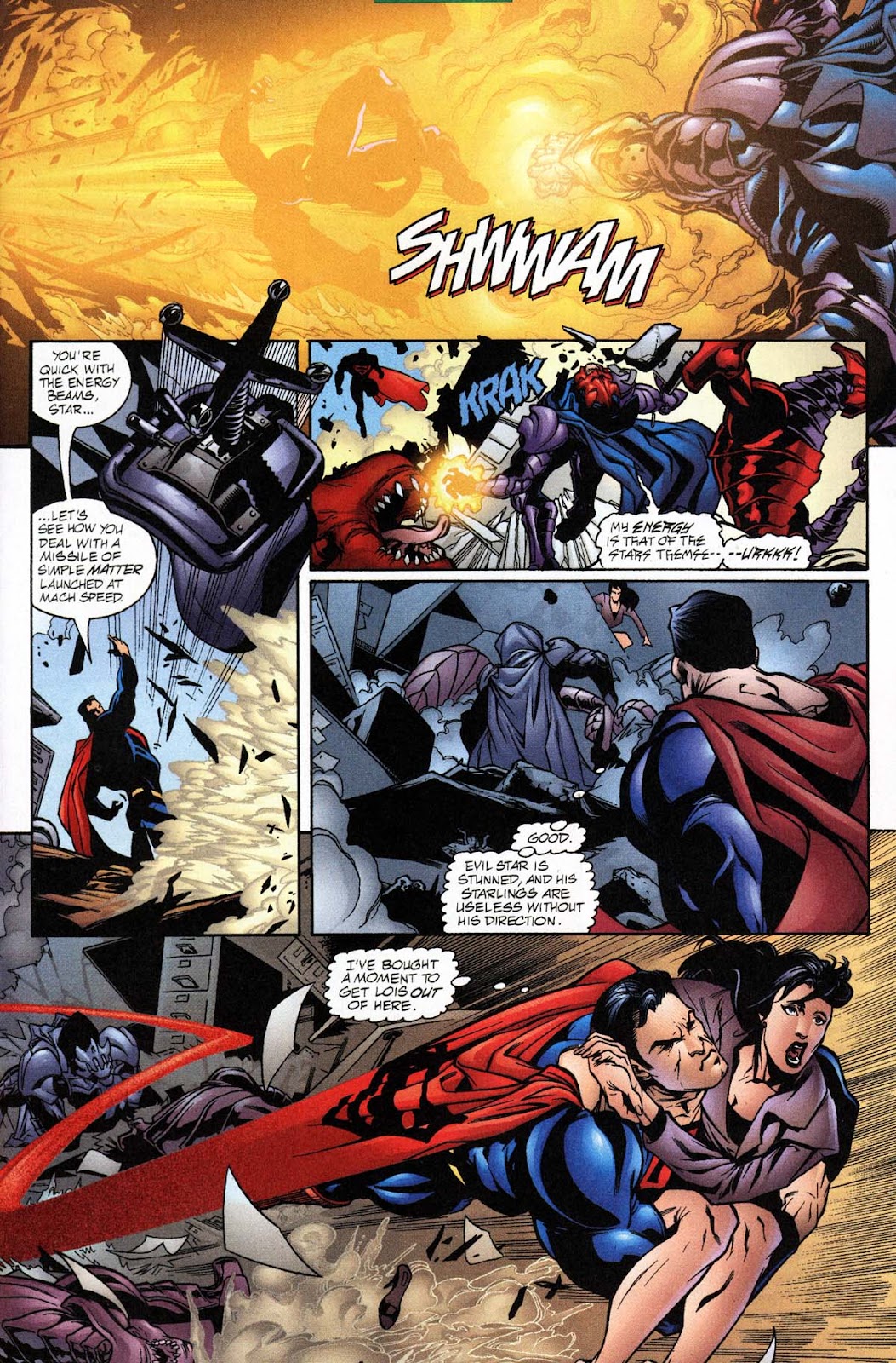 -En el arco de Ending Battle, Superman se enfrentaría a un enemigo de Green Lantern llamado Evil Star, el cual le brindaría una reverenda paliza en un combate cuerpo a cuerpo con sus ataques con el poder de un millón de soles, obligando al Hombre de Acero a utilizar la táctica de hit and run y evitar una confrontación directa con él.
