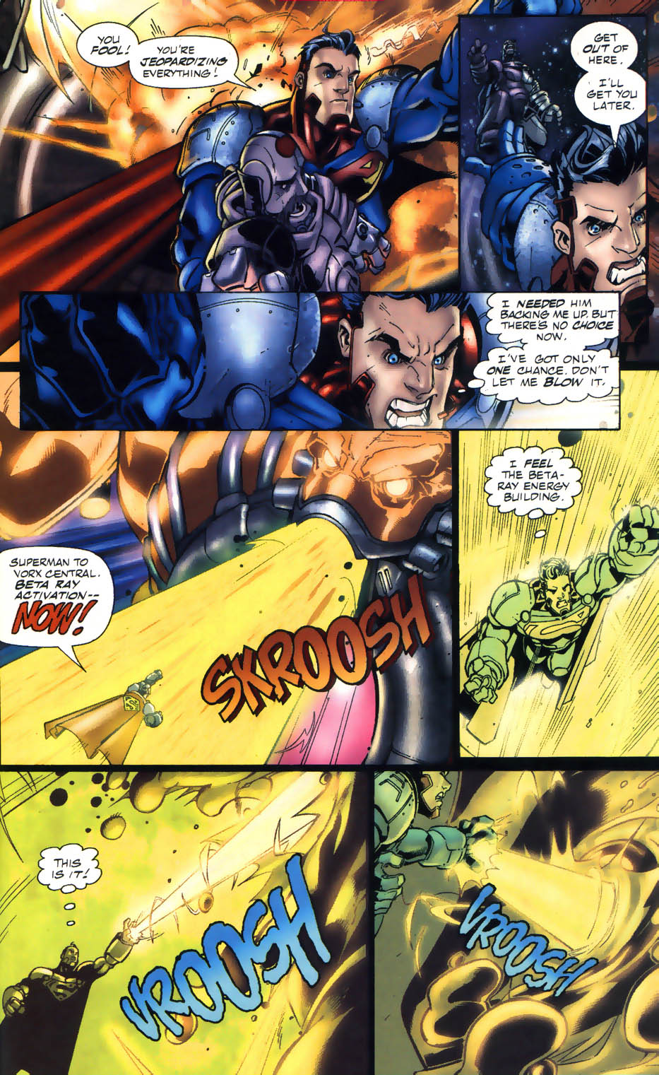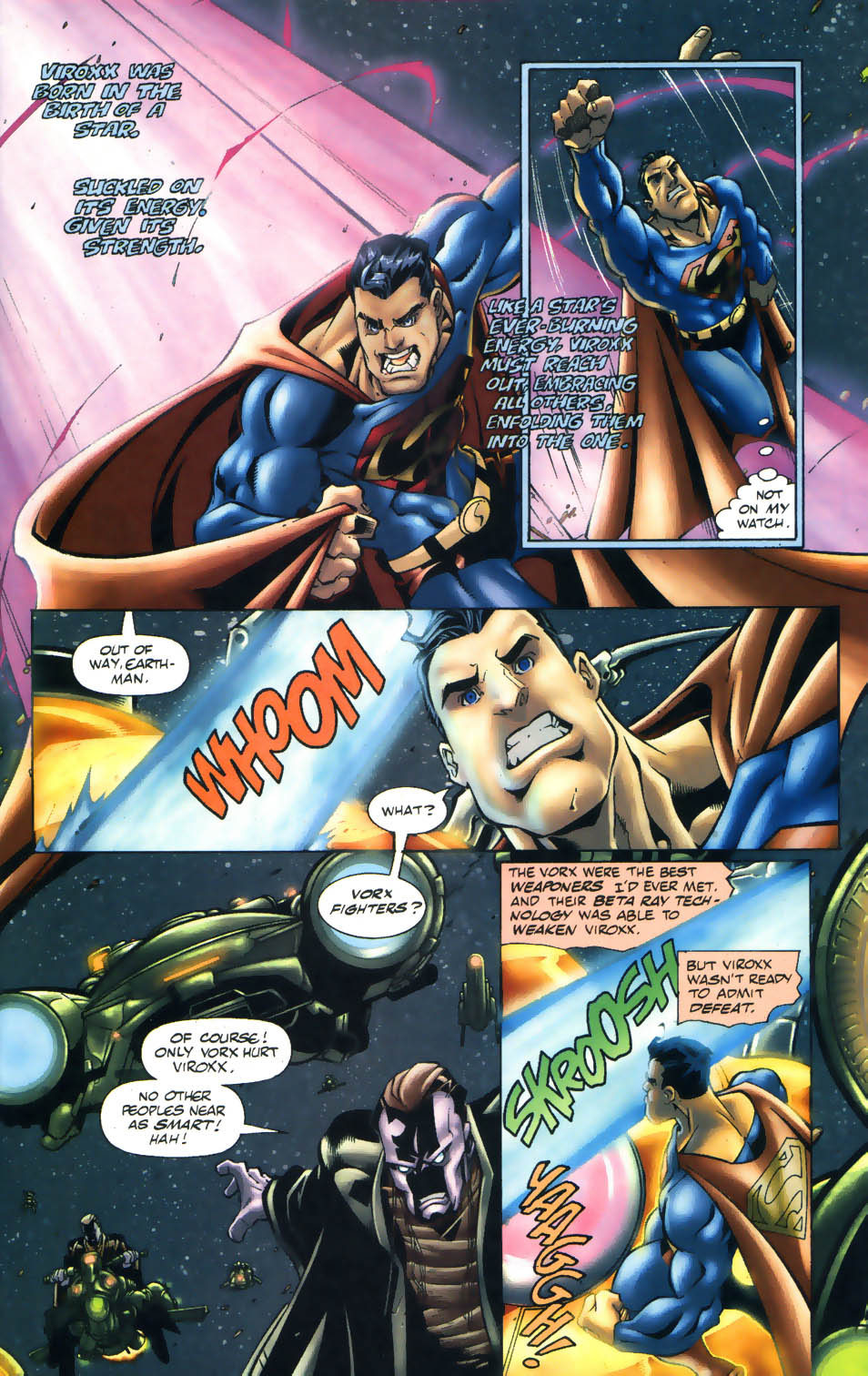 -Posteriormente Superman necesitó de una armadura espacial potenciadora construida por los Vorx para tener la oportunidad de traspasar las defensas estelares de Viroxx, y para realizar esto también tuvo que recibir ayuda adicional de la tecnología de los Vorx, dándonos a entender que en condiciones normales Superman no podría lograr tales hazañas.