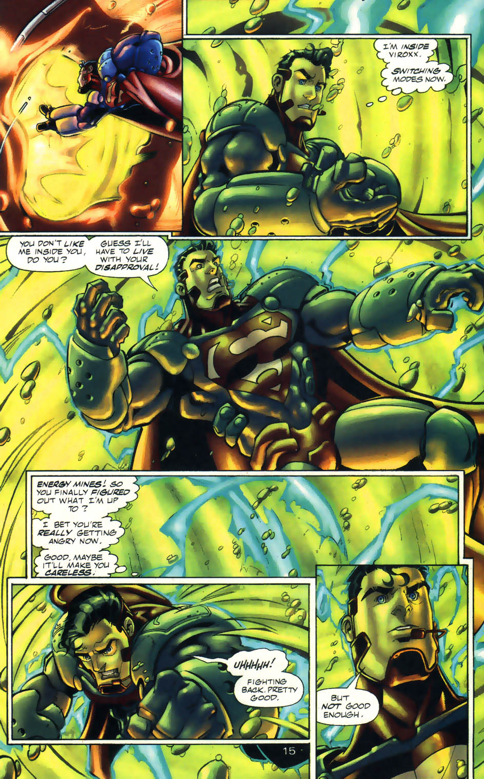 -En la Infestation Saga, Superman y sus camaradas los Vorx Fighters se enfrentarían al virus viviente Viroxx, criatura que era descrita con el poder equivalente a una estrella, dicho coloso demostró superioridad frente al Hombre de Acero y sus aliados por un amplio margen en combate, y no fue hasta que los Vorx con su tecnología redujeron el nivel de energía de Viroxx que Superman recién admitió que tenían chance de vencerlo, pero la batalla quedó inconclusa.