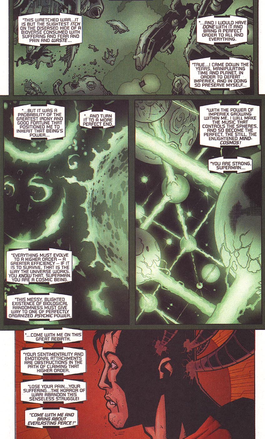 5. Osea que, en resumen, después de tantas batallas que les costaron un montón de vidas lograron derrotar a Imperiex Prime pero luego aparece Brainiac usando al villano derrotado como Power Up para joderse (Inserte meme "Que clase de..." Naruto Shippuden es esto?). Encima el desenlace fue espectacular con Superman usando todo su poder posible para empujar a ambos villanos al Big Bang (esa hazaña hace merecedor a Superman del título Salvador del universo).