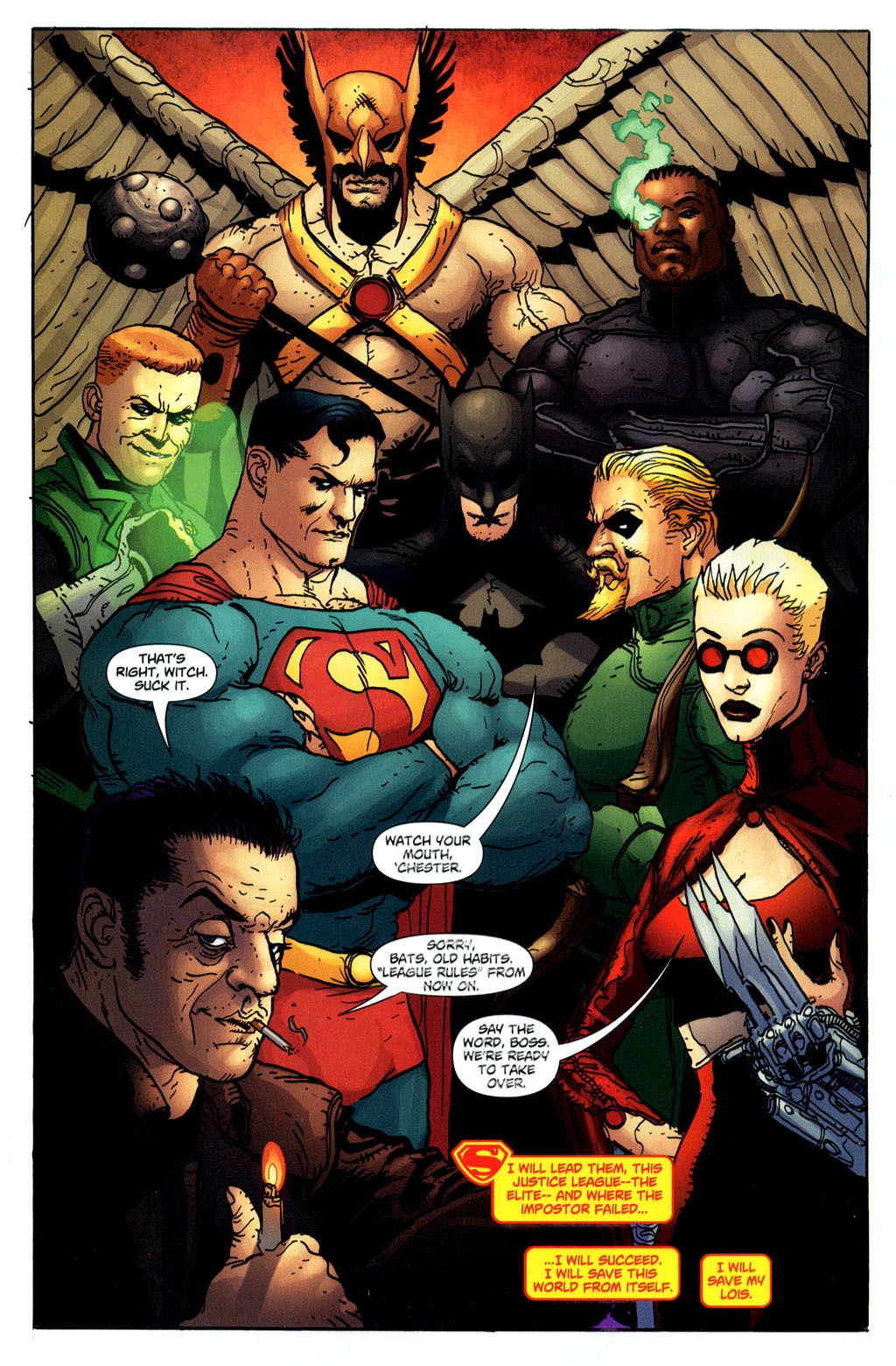 -En un principio, Black le ofreció a Superman un acuerdo pacífico para que no existieran conflictos entre ambos: El kryptoniano podría continuar su lucha contra el mal encargándose únicamente de los "científicos malvados, criaturas míticas y fenómenos en mallas que deseen conquistar el mundo"; mientras que, él y su equipo les correspondería lidiar con todo lo "serio" (dictaduras, terroristas, organizaciones criminales, etc)